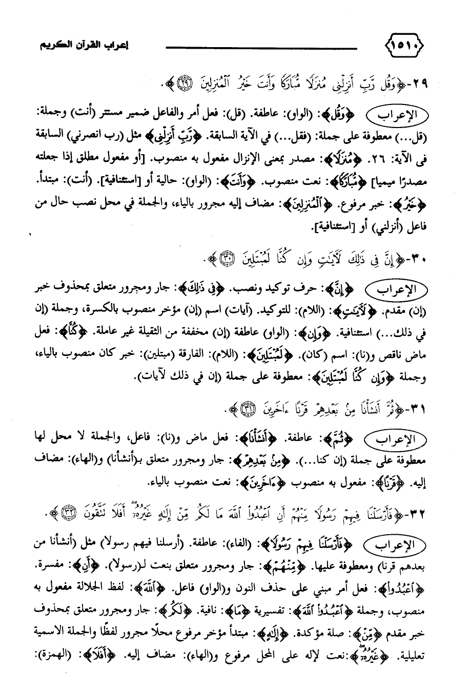 (قل ... ) معطوفة على جملة: (فقل ... ) في الآية السابقة. {رَبِّ أَنْزِلْنِي} مثل (رب انصرني) السابقة فى الآية: ٢٦. {مُنْزَلاً}: مصدر بمعنى الإنزال مفعول به منصوب. [أو مفعول مطلق إذا جعلته مصدرا ميميا] {مُبارَكاً}: نعت منصوب. {وَأَنْتَ}: (الواو): حالية أو [استئنافية]. (أنت): مبتدأ.