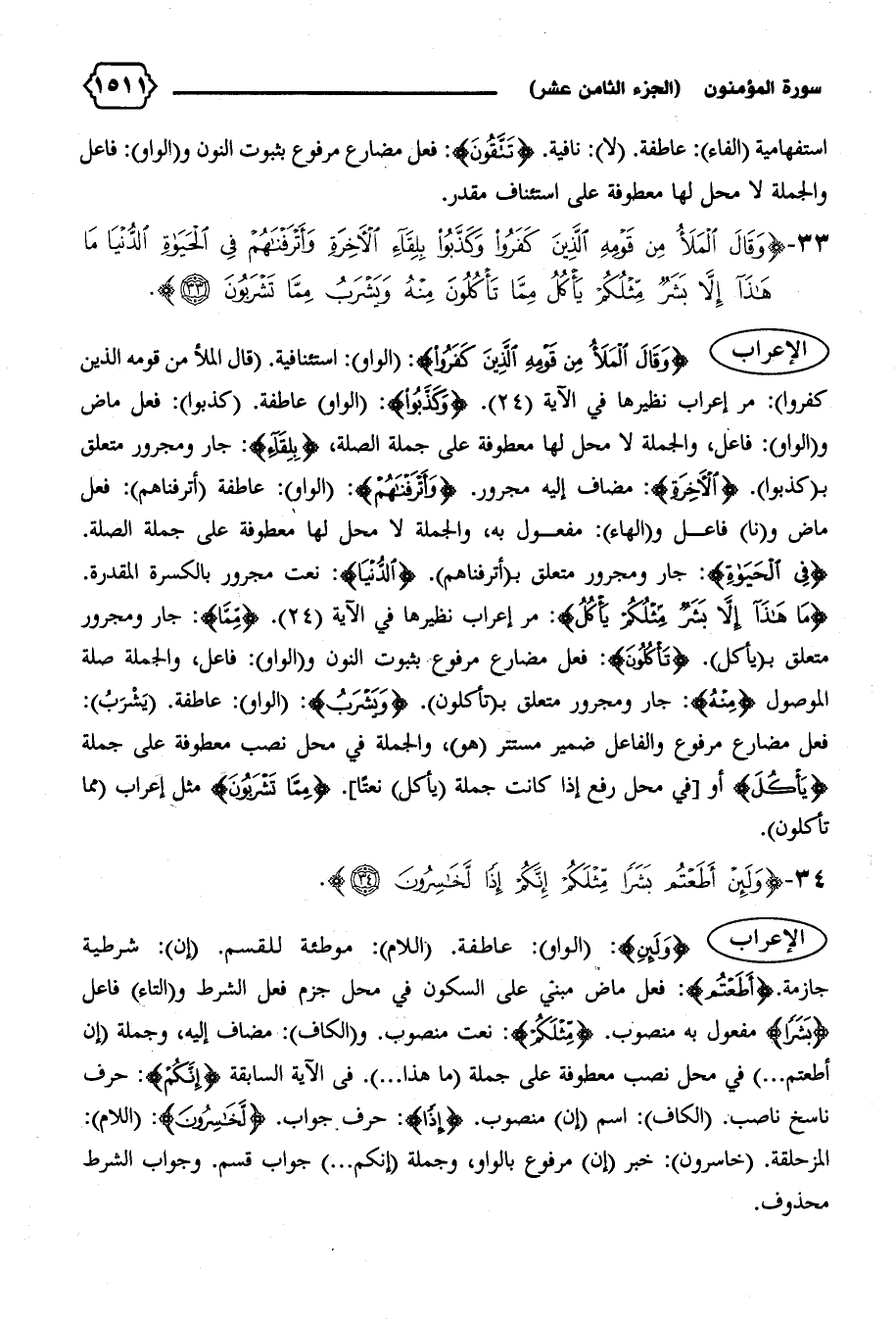 الإعراب {وَقالَ الْمَلَأُ مِنْ قَوْمِهِ الَّذِينَ كَفَرُوا}: (الواو): استئنافية. (قال الملأ من قومه الذين كفروا): مر إعراب نظيرها في الآية (٢٤). {وَكَذَّبُوا}: (الواو) عاطفة. (كذبوا): فعل ماض و (الواو): فاعل، والجملة لا محل لها معطوفة على جملة الصلة، {بِلِقاءِ}: جار ومجرور متعلق ب (كذبوا). {الْآخِرَةِ}: مضاف إليه مجرور. {وَأَتْرَفْناهُمْ}: (الواو): عاطفة (أترفناهم): فعل ماض و (نا) فاعل و (الهاء): مفعول به، والجملة لا محل لها معطوفة على جملة الصلة.