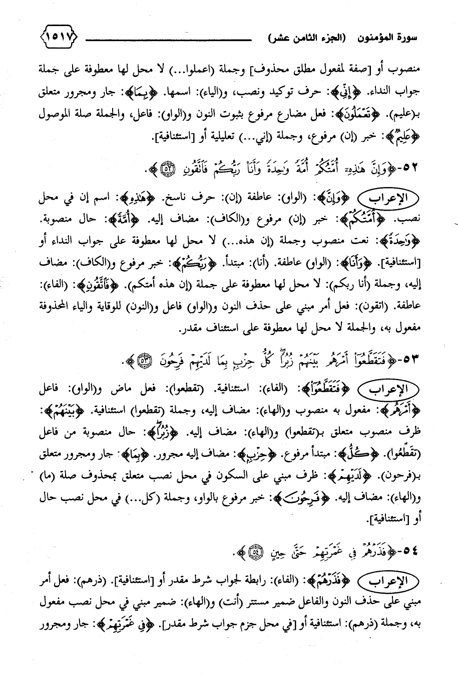 {واحِدَةً}: نعت منصوب وجملة (إن هذه ... ) لا محل لها معطوفة على جواب النداء أو [استئنافية]. {وَأَنَا}: (الواو) عاطفة. (أنا): مبتدأ. {رَبُّكُمْ}: خبر مرفوع و (الكاف): مضاف إليه، وجملة (أنا ربكم): لا محل لها معطوفة على جملة (إن هذه أمتكم). {فَاتَّقُونِ}: (الفاء):