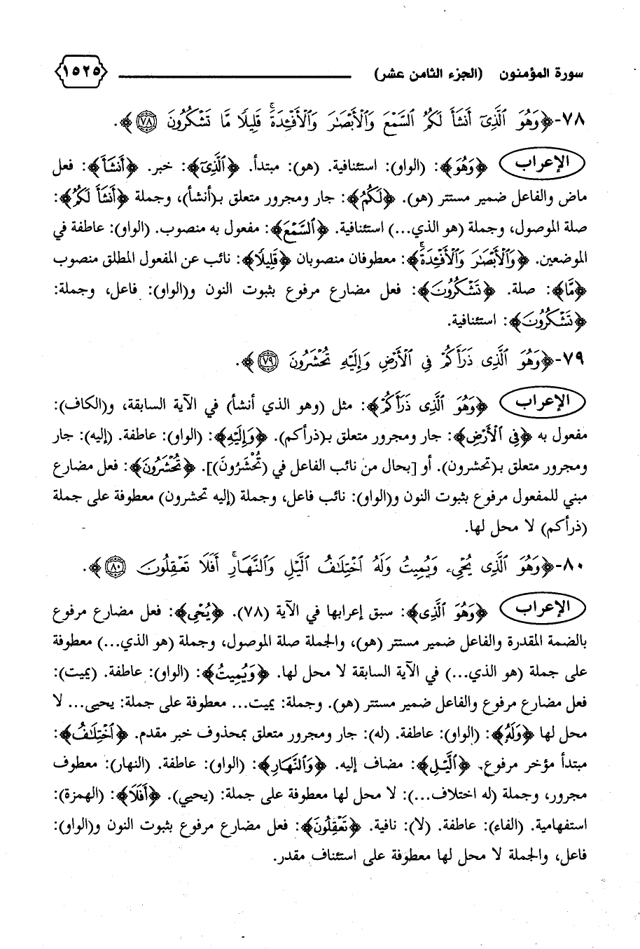 صلة الموصول، وجملة (هو الذي ... ) استئنافية. {السَّمْعَ}: مفعول به منصوب. (الواو): عاطفة في الموضعين. {وَالْأَبْصارَ وَالْأَفْئِدَةَ}: معطوفان منصوبان {قَلِيلاً}: نائب عن المفعول المطلق منصوب {ما}: صلة. {تَشْكُرُونَ}: فعل مضارع مرفوع بثبوت النون و (الواو): فاعل، وجملة:
