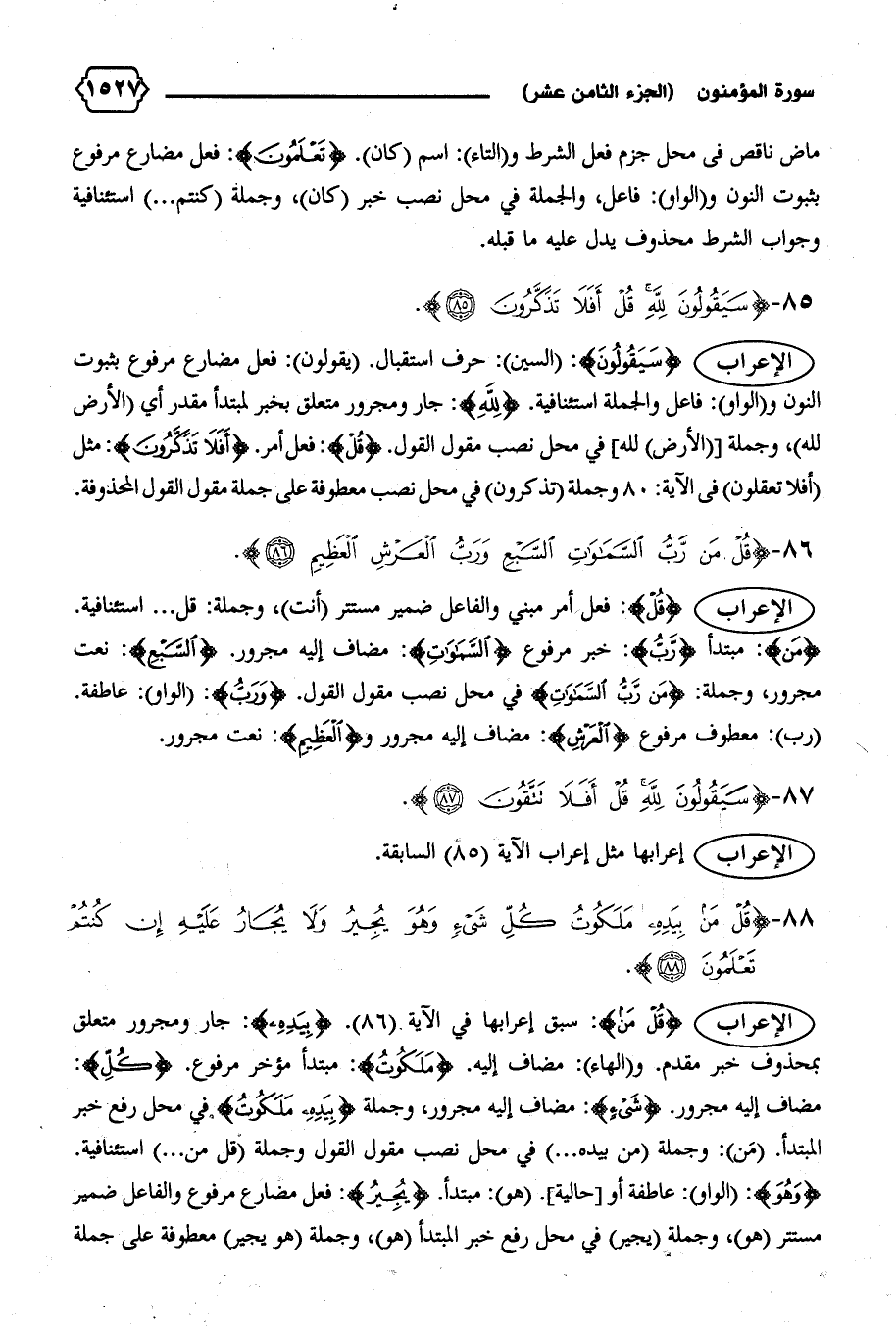 الإعراب {سَيَقُولُونَ}: (السين): حرف استقبال. (يقولون): فعل مضارع مرفوع بثبوت النون و (الواو): فاعل والجملة استئنافية. {لِلّهِ}: جار ومجرور متعلق بخبر لمبتدإ مقدر أي (الأرض لله)، وجملة [(الأرض) لله] في محل نصب مقول القول. {قُلْ}: فعل أمر. {أَفَلا تَذَكَّرُونَ}: مثل (أفلا تعقلون) فى الآية: ٨٠ وجملة (تذكرون) في محل نصب معطوفة على جملة مقول القول المحذوفة.