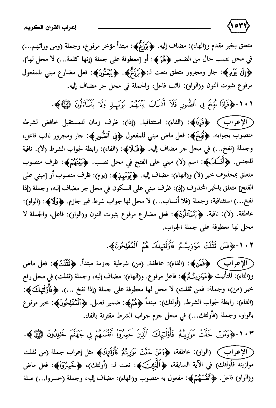 الإعراب {فَإِذا}: (الفاء): استئنافية. (إذا): ظرف زمان للمستقبل خافض لشرطه منصوب بجوابه. {نُفِخَ}: فعل ماض مبني للمفعول {فِي الصُّورِ}: جار ومجرور نائب فاعل، وجملة (نفخ ... ) في محل جر مضاف إليه. {فَلا}: (الفاء): رابطة لجواب الشرط (لا).نافية للجنس. {أَنْسابَ}: اسم (لا) مبني على الفتح في محل نصب. {بَيْنَهُمْ}: ظرف منصوب متعلق بمحذوف خبر (لا) و (الهاء): مضاف إليه. {يَوْمَئِذٍ}: (يوم): ظرف منصوب أو [مبني على الفتح] متعلق بالخبر المحذوف (إذ): ظرف مبني على السكون في محل جر مضاف إليه، وجملة (إذا نفخ ... ) استئنافية، وجملة (فلا أنساب ... ) لا محل لها جواب شرط غير جازم. {وَلا}: (الواو):
