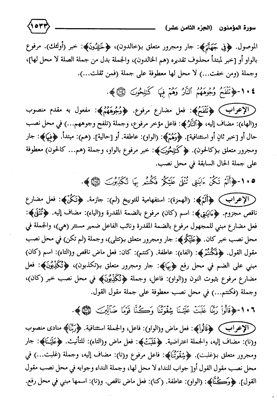 الإعراب {تَلْفَحُ}: فعل مضارع مرفوع. {وُجُوهَهُمُ}: مفعول به مقدم منصوب و (الهاء): مضاف إليه، {النّارُ}: فاعل مؤخر مرفوع، وجملة (تلفح وجوههم ... ) في محل نصب حال أو [خبر ثان أو استئنافية]. {وَهُمْ}: (الواو): عاطفة. أو [حالية]. (هم): مبتدأ. {فِيها}: جار ومجرور متعلق ب (كالحون). {كالِحُونَ}: خبر مرفوع بالواو، وجملة (هم ... كالحون) معطوفة على جملة الحال السابقة في محل نصب.