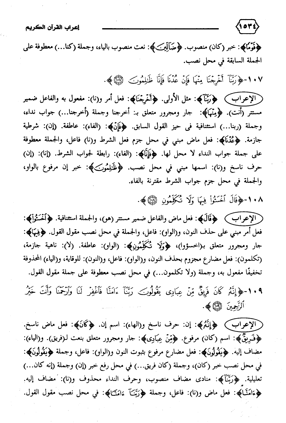 الإعراب {رَبَّنا}: مثل الأولى. {أَخْرِجْنا}: فعل أمر و (نا): مفعول به والفاعل ضمير مستتر (أنت). {مِنْها}: جار ومجرور متعلق ب: أخرجنا وجملة (أخرجنا ... ) جواب نداء، وجملة (ربنا ... ) استئنافية فى حيز القول السابق. {فَإِنْ}: (الفاء): عاطفة. (إن): شرطية جازمة. {عُدْنا}: فعل ماض مبني في محل جزم فعل الشرط و (نا) فاعل، والجملة معطوفة على جملة جواب النداء لا محل لها. {فَإِنّا}: (الفاء): رابطة لجواب الشرط. (إنا): (إن) حرف ناسخ و (نا): اسمها مبني في محل نصب. {ظالِمُونَ}: خبر إن مرفوع بالواو، والجملة في محل جزم جواب الشرط مقترنة بالفاء.