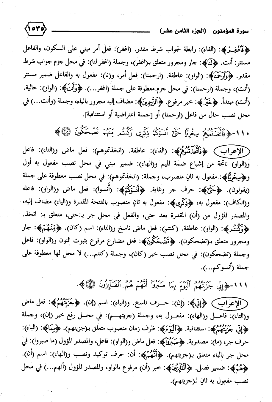 الإعراب {إِنِّي}: (إن): حرف ناسخ. و (الياء): اسم (إن). {جَزَيْتُهُمُ}: فعل ماض و (التاء): فاعل و (الهاء): مفعول به، وجملة (جزيتهم): في محل رفع خبر (إن)، وجملة {إِنِّي جَزَيْتُهُمُ}: استئنافية. {الْيَوْمَ}: ظرف زمان منصوب متعلق ب (جزيتهم). {بِما}: (الباء):