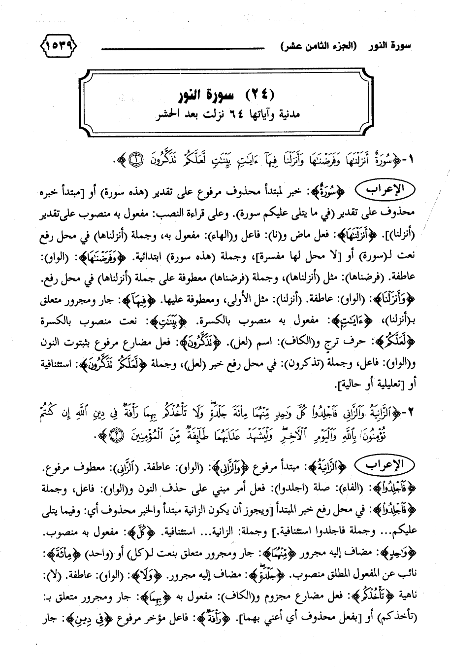 الإعراب {الزّانِيَةُ}: مبتدأ مرفوع {وَالزّانِي}: (الواو): عاطفة. (الزّانى): معطوف مرفوع.