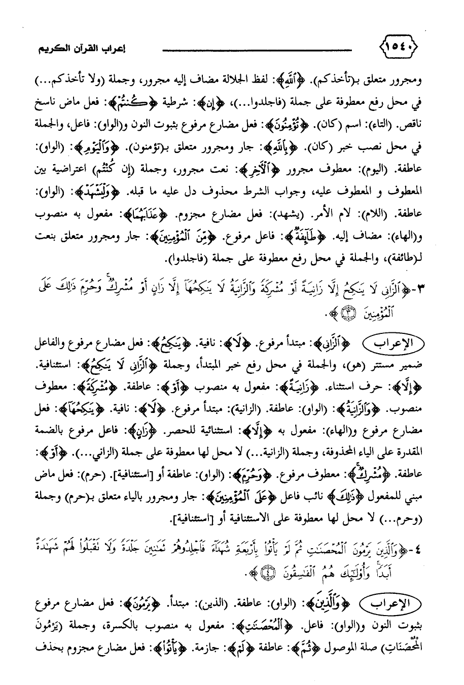 الإعراب {وَالَّذِينَ}: (الواو): عاطفة. (الذين): مبتدأ. {يَرْمُونَ}: فعل مضارع مرفوع بثبوت النون و (الواو): فاعل. {الْمُحْصَناتِ}: مفعول به منصوب بالكسرة، وجملة (يرمون المحصنات) صلة الموصول {ثُمَّ}: عاطفة {لَمْ}: جازمة. {يَأْتُوا}: فعل مضارع مجزوم بحذف