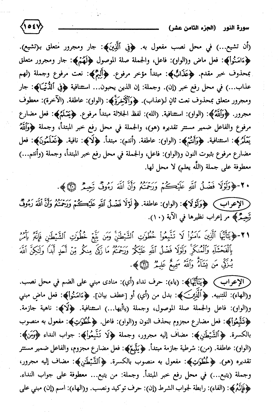 الإعراب {وَلَوْلا}: (الواو): عاطفة. {لَوْلا فَضْلُ اللهِ عَلَيْكُمْ وَرَحْمَتُهُ وَأَنَّ اللهَ رَؤُفٌ رَحِيمٌ}: مر إعراب نظيرها في الآية (١٠).