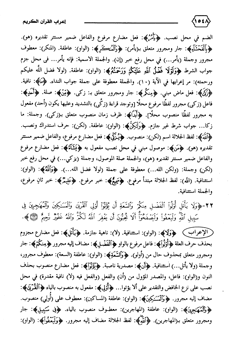 الإعراب {وَلا}: (الواو): استئنافية. (لا): ناهية جازمة. {يَأْتَلِ}: فعل مضارع مجزوم بحذف حرف العلة {أُولُوا}: فاعل مرفوع بالواو {الْفَضْلِ}: مضاف إليه مجرور {مِنْكُمْ}: جار ومجرور متعلق بمحذوف حال من (أولو). {وَالسَّعَةِ}: (الواو): عاطفة (السعة): معطوف مجرور، وجملة (ولا يأتل ... ) استئنافية. {أَنْ}: مصدرية ناصبة. {يُؤْتُوا}: فعل مضارع منصوب بحذف النون و (الواو): فاعل، والمصدر المؤول من (أن) والفعل (والفعل فيه (لا) نافية مقدرة) في محل نصب على نزع الخافض والتقدير على ألا يؤتوا ... {أُولِي}: مفعول به منصوب بالياء {الْقُرْبى}: