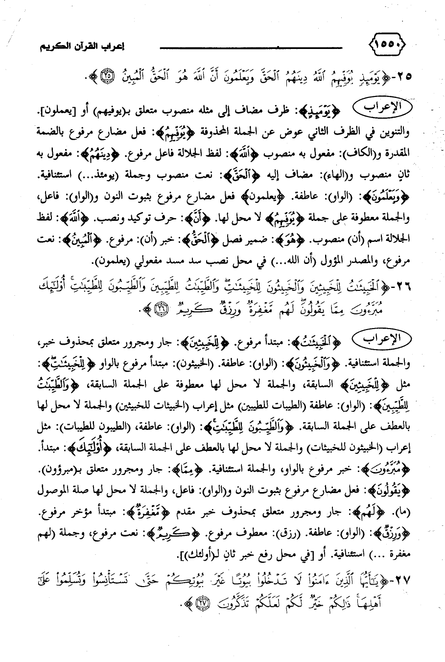 مثل {لِلْخَبِيثِينَ} السابقة، والجملة لا محل لها معطوفة على الجملة السابقة، {وَالطَّيِّباتُ لِلطَّيِّبِينَ}: (الواو): عاطفة (الطيبات للطيبين) مثل إعراب (الخبيثات للخبيثين) والجملة لا محل لها بالعطف على الجملة السابقة. {وَالطَّيِّبُونَ لِلطَّيِّباتِ}: (الواو): عاطفة، (الطيبون للطيبات): مثل إعراب (الخبيثون للخبيثات) والجملة لا محل لها بالعطف على الجملة السابقة، {أُولئِكَ}: مبتدأ.