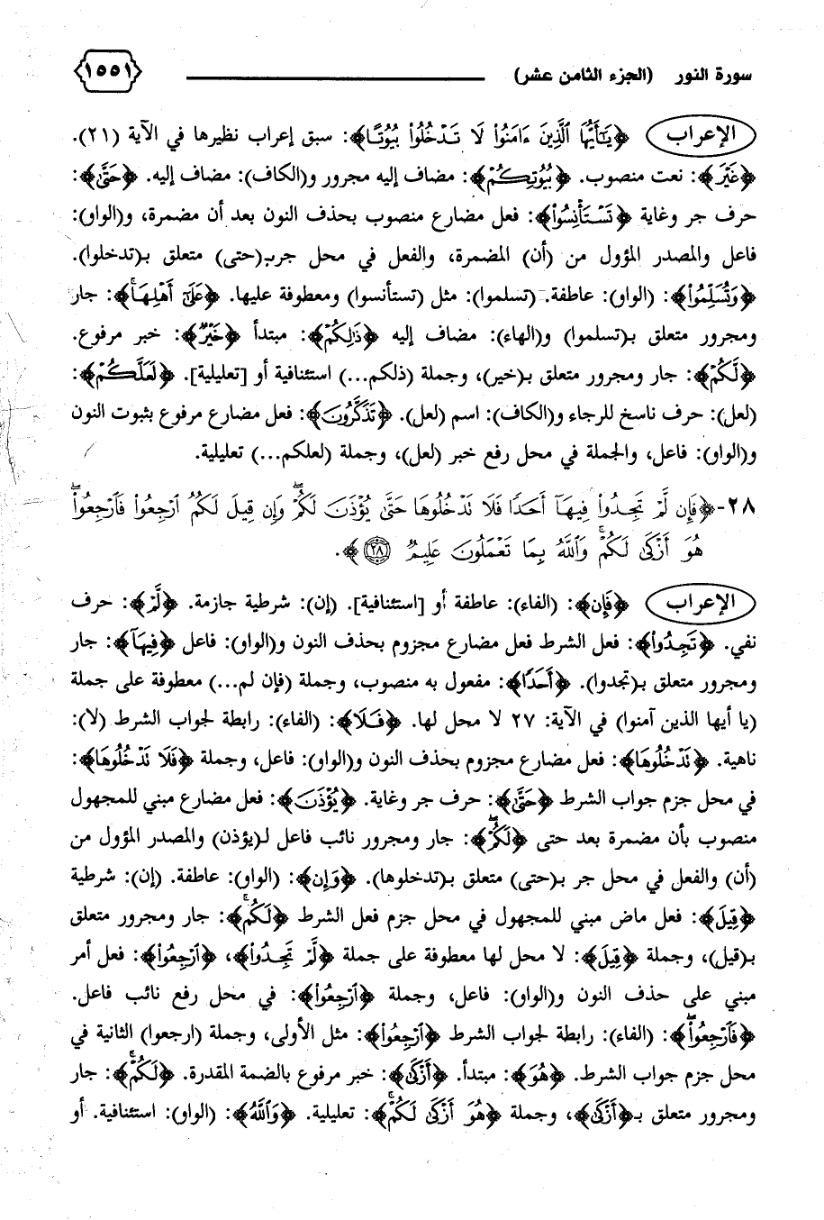 الإعراب {يا أَيُّهَا الَّذِينَ آمَنُوا لا تَدْخُلُوا بُيُوتاً}: سبق إعراب نظيرها في الآية (٢١).