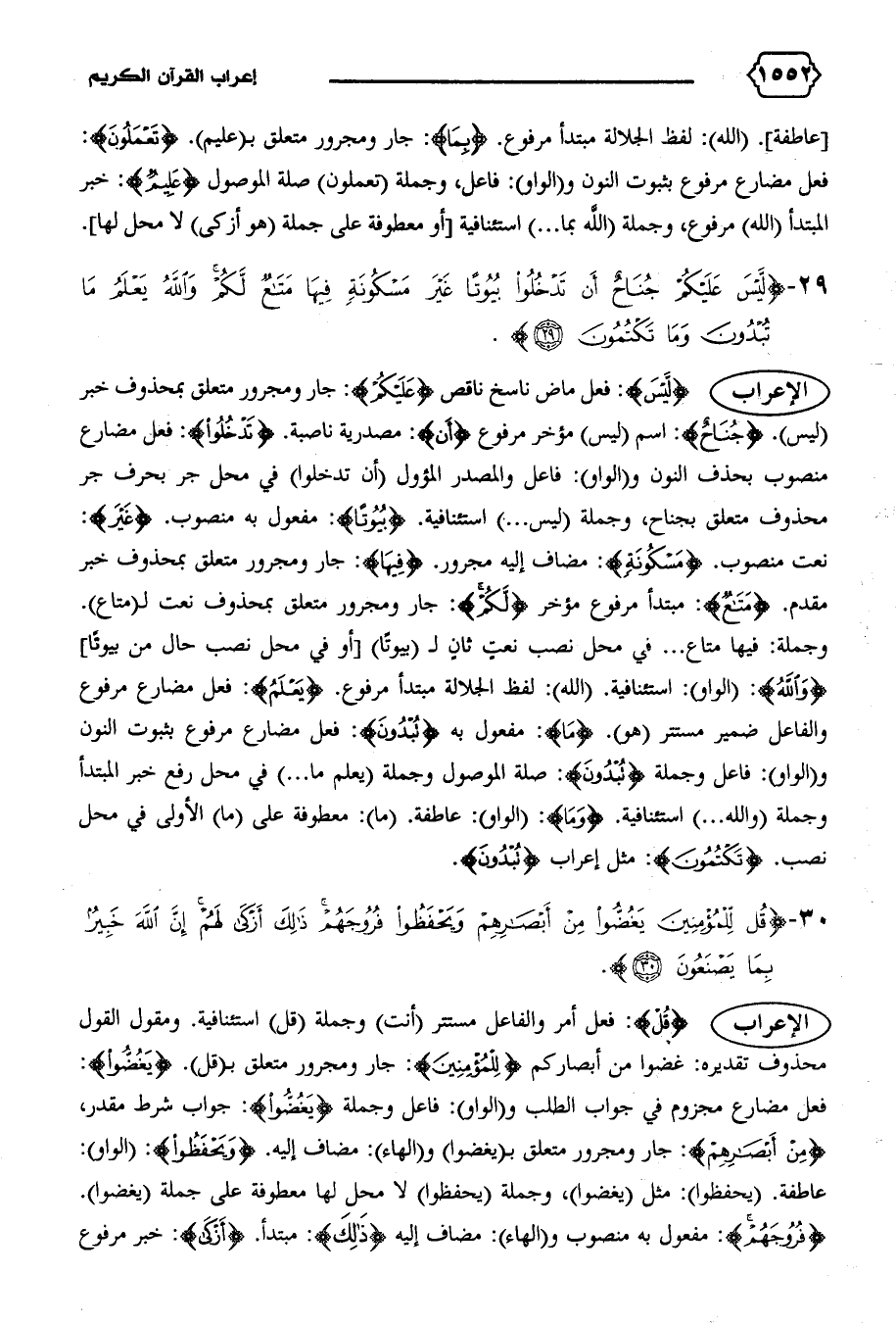 الإعراب {لَيْسَ}: فعل ماض ناسخ ناقص {عَلَيْكُمْ}: جار ومجرور متعلق بمحذوف خبر (ليس). {جُناحٌ}: اسم (ليس) مؤخر مرفوع {أَنْ}: مصدرية ناصبة. {تَدْخُلُوا}: فعل مضارع منصوب بحذف النون و (الواو): فاعل والمصدر المؤول (أن تدخلوا) في محل جر بحرف جر محذوف متعلق بجناح، وجملة (ليس ... ) استئنافية. {بُيُوتاً}: مفعول به منصوب. {غَيْرَ}: