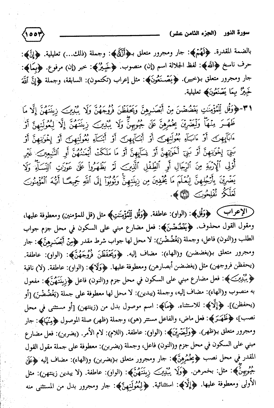 (يحفظن فروجهن) مثل (يغضضن أبصارهن) ومعطوفة عليها. {وَلا}: (الواو): عاطفة. (لا) نافية {يُبْدِينَ}: فعل مضارع مبني على السكون في محل جزم و (النون) فاعل {زِينَتَهُنَّ}: مفعول به منصوب و (الهاء): مضاف إليه، وجملة (يبدين): لا محل لها معطوفة على جملة (يغضضن) [أو (يحفظن)]. {إِلاّ}: للاستثناء. {ما}: اسم موصول بدل من (زينتهن) [أو مستثنى في محل نصب]، {ظَهَرَ}: فعل ماض، والفاعل مستتر (هو)، وجملة (ظهر) صلة الموصول {مِنْها}: جار ومجرور متعلق ب (ظهر). {وَلْيَضْرِبْنَ}: (الواو): عاطفة. (اللام): لام الأمر. (يضربن): فعل مضارع مبني على السكون في محل جزم و (النون) فاعل، وجملة (يضربن): معطوفة على جملة مقول القول المقدر في محل نصب {بِخُمُرِهِنَّ}: جار ومجرور متعلق ب (يضربن) و (الهاء): مضاف إليه {عَلى جُيُوبِهِنَّ}: مثل: بخمرهن. {وَلا يُبْدِينَ زِينَتَهُنَّ}: (الواو): عاطفة. (لا يبدين زينتهن): مثل الأولى ومعطوفة عليها. {إِلاّ}: استثنائية. {لِبُعُولَتِهِنَّ}: جار ومجرور بدل من المستثنى منه