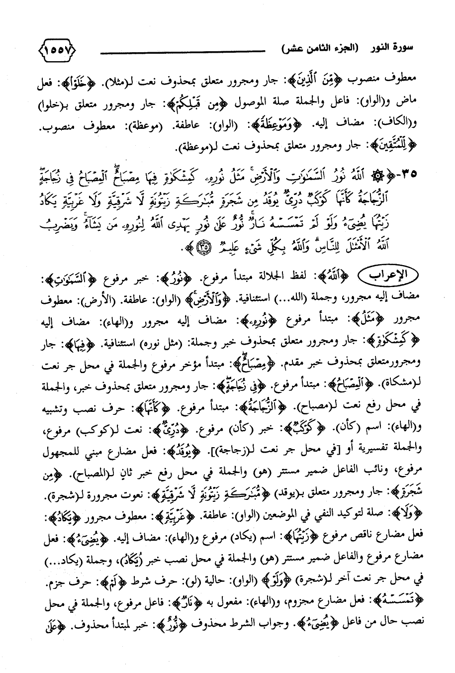 مضاف إليه مجرور، وجملة (الله ... ) استئنافية. {وَالْأَرْضِ} (الواو): عاطفة. (الأرض): معطوف مجرور {مَثَلُ}: مبتدأ مرفوع {نُورِهِ}: مضاف إليه مجرور و (الهاء): مضاف إليه {كَمِشْكاةٍ}: جار ومجرور متعلق بمحذوف خبر وجملة: (مثل نوره) استئنافية. {فِيها}: جار ومجرور متعلق بمحذوف خبر مقدم. {مِصْباحٌ}: مبتدأ مؤخر مرفوع والجملة في محل جر نعت ل (مشكاة). {الْمِصْباحُ}: مبتدأ مرفوع. {فِي زُجاجَةٍ}: جار ومجرور متعلق بمحذوف خبر، والجملة في محل رفع نعت ل (مصباح). {الزُّجاجَةُ}: مبتدأ مرفوع. {كَأَنَّها}: حرف نصب وتشبيه و (الهاء): اسم (كأن). {كَوْكَبٌ}: خبر (كأن) مرفوع. {دُرِّيٌّ}: نعت ل (كوكب) مرفوع، والجملة تفسيرية أو [في محل جر نعت ل (زجاجة)]. {يُوقَدُ}: فعل مضارع مبني للمجهول مرفوع، ونائب الفاعل ضمير مستتر (هو) والجملة في محل رفع خبر ثان ل (المصباح). {مِنْ شَجَرَةٍ}: جار ومجرور متعلق ب (يوقد) {مُبارَكَةٍ زَيْتُونَةٍ لا شَرْقِيَّةٍ}: نعوت مجرورة ل (شجرة).