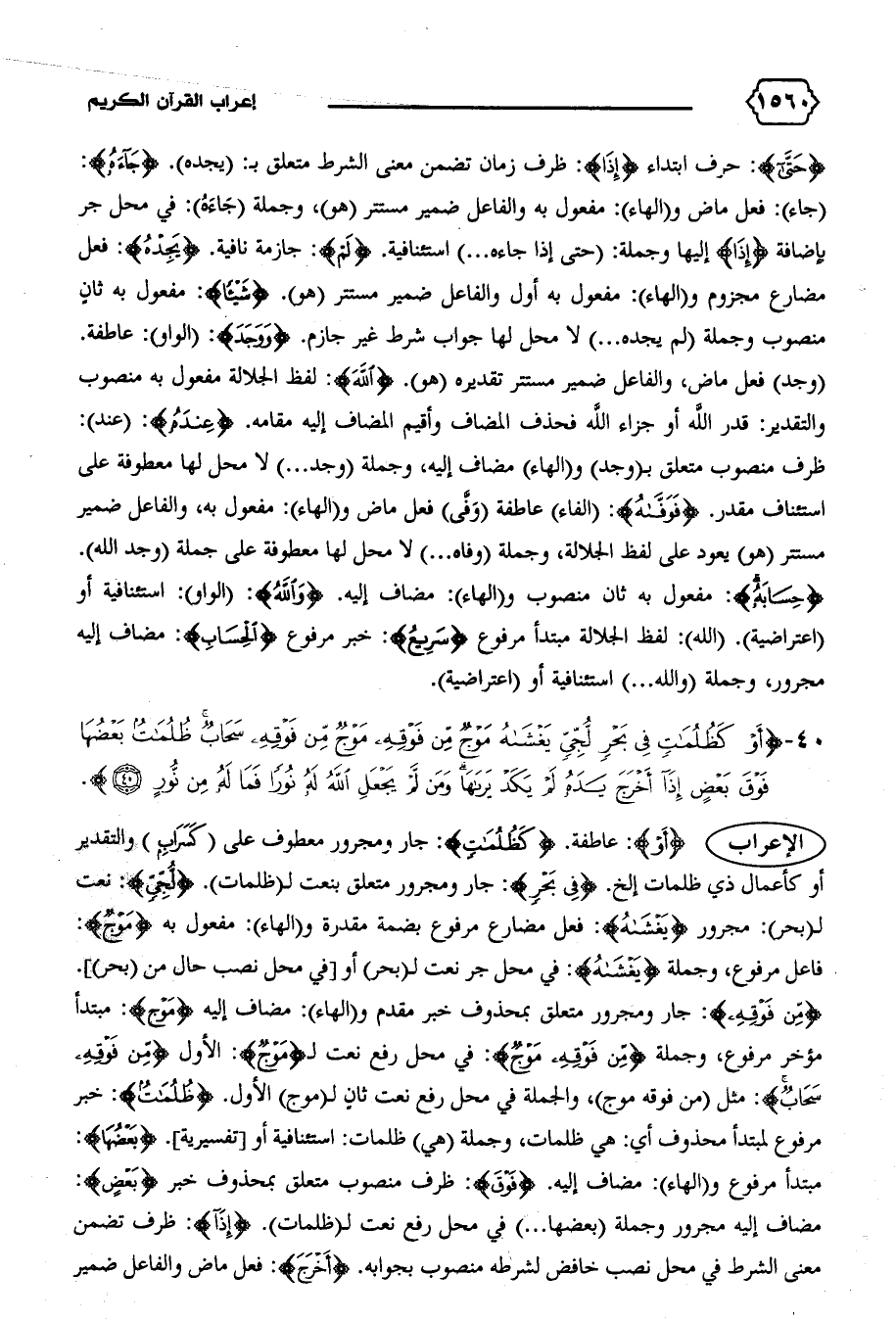 الإعراب {أَوْ}: عاطفة. {كَظُلُماتٍ}: جار ومجرور معطوف على (كسراب) والتقدير أو كأعمال ذي ظلمات إلخ. {فِي بَحْرٍ}: جار ومجرور متعلق بنعت ل (ظلمات). {لُجِّيٍّ}: نعت ل (بحر): مجرور {يَغْشاهُ}: فعل مضارع مرفوع بضمة مقدرة و (الهاء): مفعول به {مَوْجٌ}: