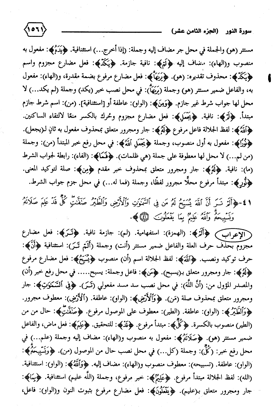 مستتر (هو) والجملة في محل جر مضاف إليه وجملة: (إذا أخرج ... ) استئنافية. {يَدَهُ}: مفعول به منصوب و (الهاء): مضاف إليه {لَمْ}: نافية جازمة. {يَكَدْ}: فعل مضارع مجزوم واسم {يَكَدْ}: محذوف تقديره: (هو). {يَراها}: فعل مضارع مرفوع بضمة مقدرة، و (الهاء): مفعول به، والفاعل ضمير مستتر (هو) وجملة (يراها): في محل نصب خبر (يكد) وجملة (لم يكد ... ) لا محل لها جواب شرط غير جازم. {وَمَنْ}: (الواو): عاطفة أو [استئنافية]. (من): اسم شرط جازم مبتدأ. {لَمْ}: نافية. {يَجْعَلِ}: فعل مضارع مجزوم وحرك بالكسر منعا لالتقاء الساكنين.