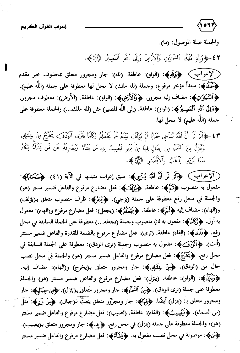 مفعول به منصوب {ثُمَّ}: عاطفة. {يُؤَلِّفُ}: فعل مضارع مرفوع والفاعل ضمير مستتر (هو) والجملة في محل رفع معطوفة على جملة (يزجي). {بَيْنَهُ}: ظرف منصوب متعلق ب (يؤلف) و (الهاء): مضاف إليه {ثُمَّ}: عاطفة. {يَجْعَلُهُ}: (يجعل): فعل مضارع مرفوع و (الهاء): مفعول به أول. {رُكاماً}: مفعول به ثان منصوب وجملة (يجعله ... ) معطوفة على الجملة السابقة في محل رفع. {فَتَرَى}: (الفاء) عاطفة. (ترى): فعل مضارع مرفوع بالضمة المقدرة والفاعل ضمير مستتر (أنت). {الْوَدْقَ}: مفعول به منصوب وجملة (ترى الودق): معطوفة على الجملة السابقة في محل رفع. {يَخْرُجُ}: فعل مضارع مرفوع والفاعل ضمير مستتر (هو) والجملة في محل نصب حال من (الودق). {مِنْ خِلالِهِ}: جار ومجرور متعلق ب (يخرج) و (الهاء): مضاف إليه.