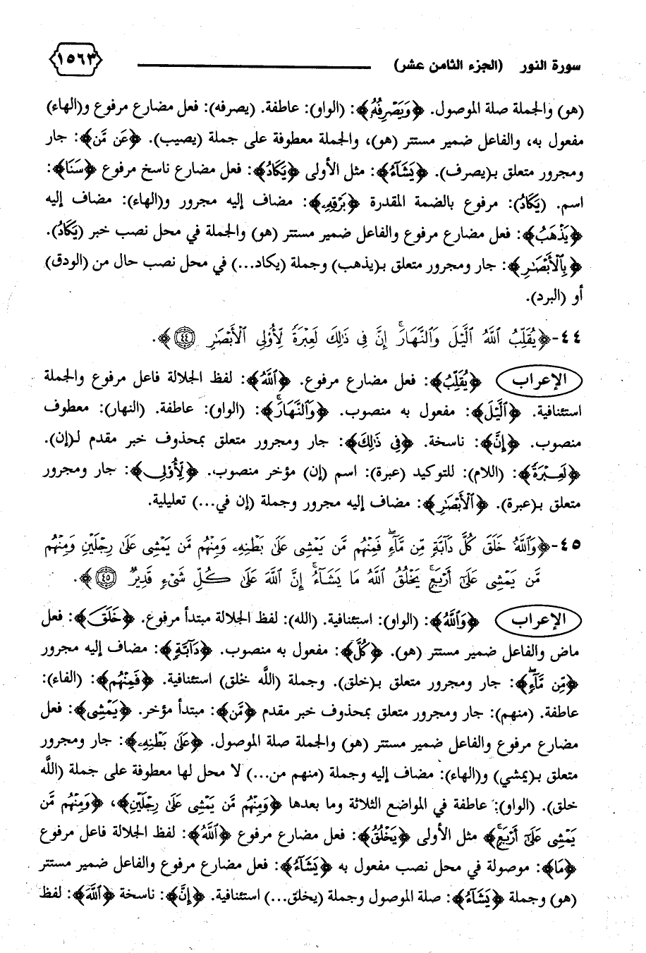 (هو) والجملة صلة الموصول. {وَيَصْرِفُهُ}: (الواو): عاطفة. (يصرفه): فعل مضارع مرفوع و (الهاء) مفعول به، والفاعل ضمير مستتر (هو)، والجملة معطوفة على جملة (يصيب). {عَنْ مَنْ}: جار ومجرور متعلق ب (يصرف). {يَشاءُ}: مثل الأولى {يَكادُ}: فعل مضارع ناسخ مرفوع {سَنا}: