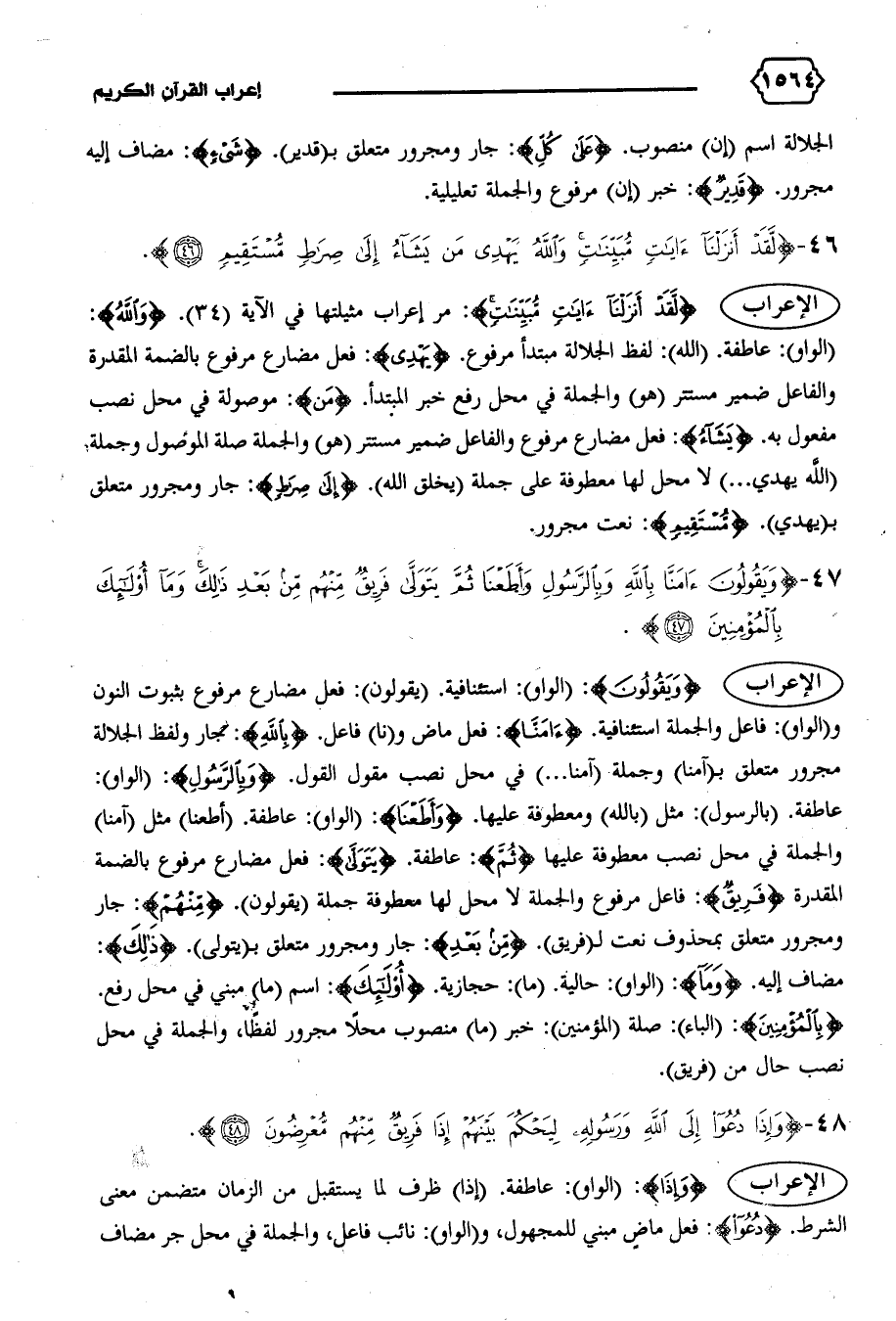 الإعراب {لَقَدْ أَنْزَلْنا آياتٍ مُبَيِّناتٍ}: مر إعراب مثيلتها في الآية (٣٤). {وَاللهُ}: