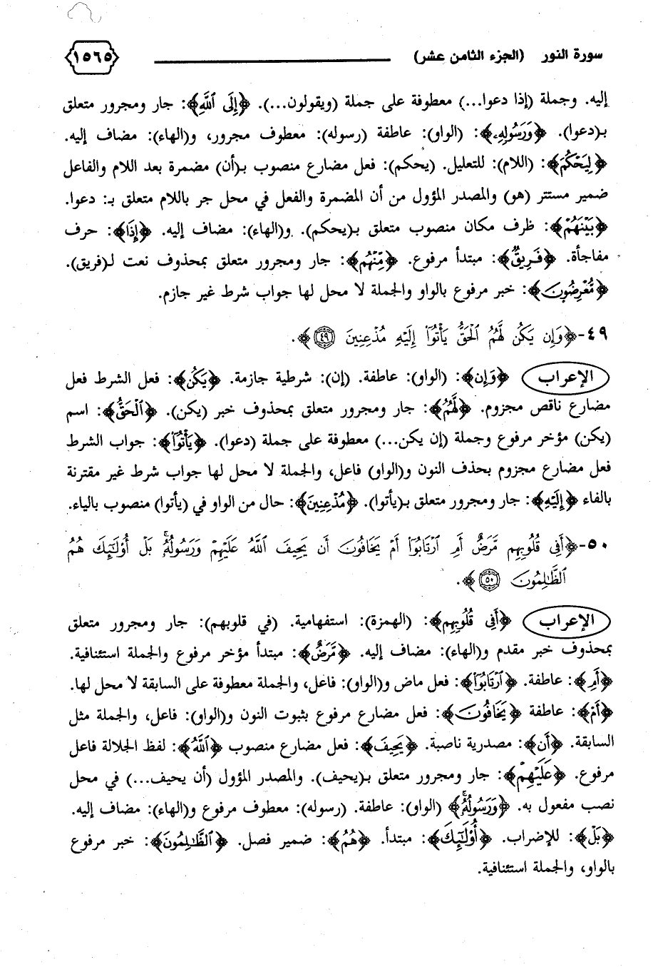 إليه. وجملة (إذا دعوا ... ) معطوفة على جملة (ويقولون ... ). {إِلَى اللهِ}: جار ومجرور متعلق ب (دعوا). {وَرَسُولِهِ}: (الواو): عاطفة (رسوله): معطوف مجرور، و (الهاء): مضاف إليه.