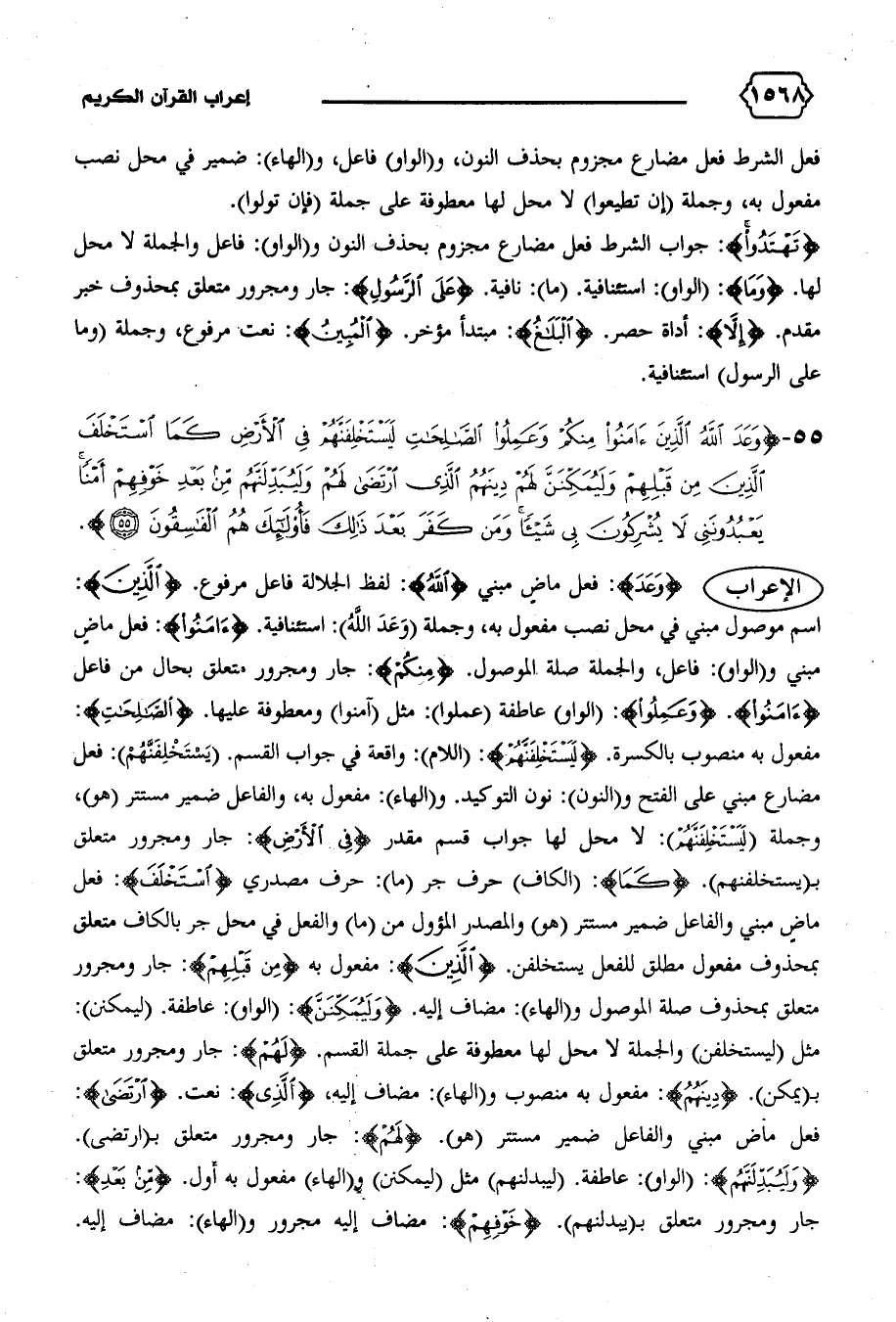 مفعول به منصوب بالكسرة. {لَيَسْتَخْلِفَنَّهُمْ}: (اللام): واقعة في جواب القسم. (يستخلفنّهم): فعل مضارع مبني على الفتح و (النون): نون التوكيد. و (الهاء): مفعول به، والفاعل ضمير مستتر (هو)، وجملة (ليستخلفنّهم): لا محل لها جواب قسم مقدر {فِي الْأَرْضِ}: جار ومجرور متعلق ب (يستخلفنهم). {كَمَا}: (الكاف) حرف جر (ما): حرف مصدري {اِسْتَخْلَفَ}: فعل ماض مبني والفاعل ضمير مستتر (هو) والمصدر المؤول من (ما) والفعل في محل جر بالكاف متعلق بمحذوف مفعول مطلق للفعل يستخلفن. {الَّذِينَ}: مفعول به {مِنْ قَبْلِهِمْ}: جار ومجرور متعلق بمحذوف صلة الموصول و (الهاء): مضاف إليه. {وَلَيُمَكِّنَنَّ}: (الواو): عاطفة. (ليمكنن):