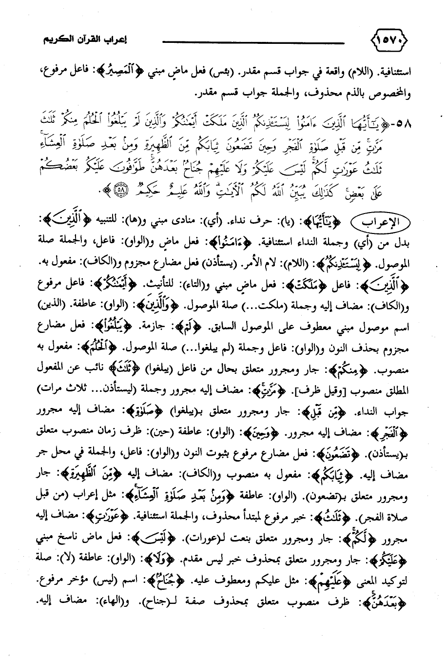 {الَّذِينَ}: فاعل {مَلَكَتْ}: فعل ماض مبني و (التاء): للتأنيث. {أَيْمانُكُمْ}: فاعل مرفوع و (الكاف): مضاف إليه وجملة (ملكت ... ) صلة الموصول. {وَالَّذِينَ}: (الواو): عاطفة. (الذين) اسم موصول مبني معطوف على الموصول السابق. {لَمْ}: جازمة. {يَبْلُغُوا}: فعل مضارع مجزوم بحذف النون و (الواو): فاعل وجملة (لم يبلغوا ... ) صلة الموصول. {الْحُلُمَ}: مفعول به منصوب. {مِنْكُمْ}: جار ومجرور متعلق بحال من فاعل (يبلغوا) {ثَلاثَ}: نائب عن المفعول المطلق منصوب [وقيل ظرف]. {مَرّاتٍ}: مضاف إليه مجرور وجملة (ليستأذن ... ثلاث مرات) جواب النداء. {مِنْ قَبْلِ}: جار ومجرور متعلق ب (يبلغوا) {صَلاةِ}: مضاف إليه مجرور {الْفَجْرِ}: مضاف إليه مجرور. {وَحِينَ}: (الواو): عاطفة (حين): ظرف زمان منصوب متعلق ب (يستأذن). {تَضَعُونَ}: فعل مضارع مرفوع بثبوت النون و (الواو): فاعل، والجملة في محل جر مضاف إليه. {ثِيابَكُمْ}: مفعول به منصوب و (الكاف): مضاف إليه {مِنَ الظَّهِيرَةِ}: جار ومجرور متعلق ب (تضعون). (الواو): عاطفة {وَمِنْ بَعْدِ صَلاةِ الْعِشاءِ}: مثل إعراب (من قبل صلاة الفجر). {ثَلاثَ}: خبر مرفوع لمبتدإ محذوف، والجملة استئنافية. {عَوْراتٍ}: مضاف إليه مجرور {لَكُمْ}: جار ومجرور متعلق بنعت ل (عورات). {لَيْسَ}: فعل ماض ناسخ منبي {عَلَيْكُمْ}: جار ومجرور متعلق بمحذوف خبر ليس مقدم. {وَلا}: (الواو): عاطفة (لا): صلة لتوكيد المعنى {عَلَيْهِمْ}: مثل عليكم ومعطوف عليه. {جُناحٌ}: اسم (ليس) مؤخر مرفوع.