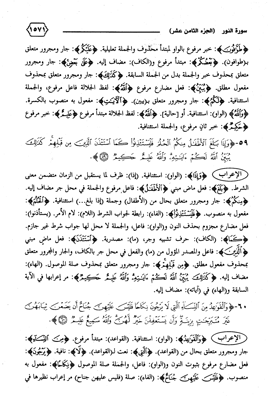 {طَوّافُونَ}: خبر مرفوع بالواو لمبتدإ محذوف والجملة تعليلية. {عَلَيْكُمْ}: جار ومجرور متعلق ب (طوافون). {بَعْضُكُمْ}: مبتدأ مرفوع و (الكاف): مضاف إليه. {عَلى بَعْضٍ}: جار ومجرور متعلق بمحذوف خبر والجملة بدل من الجملة السابقة. {كَذلِكَ}: جار ومجرور متعلق بمحذوف مفعول مطلق. {يُبَيِّنُ}: فعل مضارع مرفوع {اللهُ}: لفظ الجلالة فاعل مرفوع، والجملة استئنافية. {لَكُمْ}: جار ومجرور متعلق ب (يبين). {الْآياتِ}: مفعول به منصوب بالكسرة.