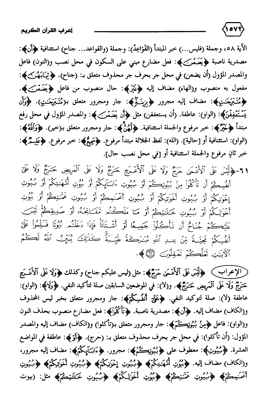 {لَيْسَ عَلَى الْأَعْمى حَرَجٌ وَلا عَلَى الْأَعْرَجِ حَرَجٌ وَلا عَلَى الْمَرِيضِ حَرَجٌ وَلا عَلى أَنْفُسِكُمْ أَنْ تَأْكُلُوا مِنْ بُيُوتِكُمْ أَوْ بُيُوتِ آبائِكُمْ أَوْ بُيُوتِ أُمَّهاتِكُمْ أَوْ بُيُوتِ إِخْوانِكُمْ أَوْ بُيُوتِ أَخَواتِكُمْ أَوْ بُيُوتِ أَعْمامِكُمْ أَوْ بُيُوتِ عَمّاتِكُمْ أَوْ بُيُوتِ أَخْوالِكُمْ أَوْ بُيُوتِ خالاتِكُمْ أَوْ ما مَلَكْتُمْ مَفاتِحَهُ أَوْ صَدِيقِكُمْ لَيْسَ عَلَيْكُمْ جُناحٌ أَنْ تَأْكُلُوا جَمِيعاً أَوْ أَشْتاتاً فَإِذا دَخَلْتُمْ بُيُوتاً فَسَلِّمُوا عَلى أَنْفُسِكُمْ تَحِيَّةً مِنْ عِنْدِ اللهِ مُبارَكَةً طَيِّبَةً كَذلِكَ يُبَيِّنُ اللهُ لَكُمُ الْآياتِ لَعَلَّكُمْ تَعْقِلُونَ (٦١)}