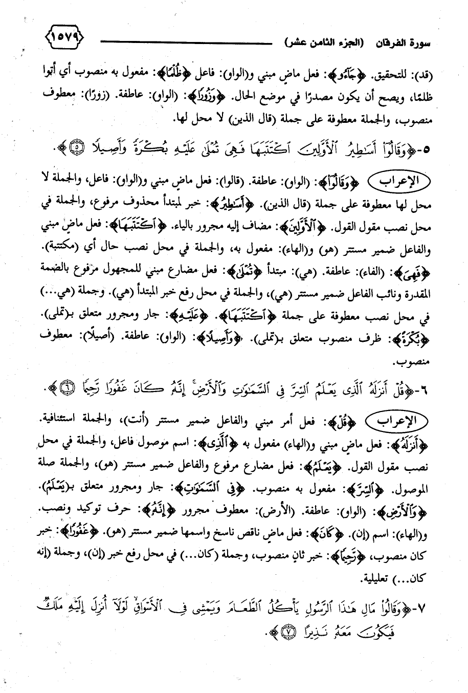 الإعراب {وَقالُوا}: (الواو): عاطفة. (قالوا): فعل ماض مبني و (الواو): فاعل، والجملة لا محل لها معطوفة على جملة (قال الذين). {أَساطِيرُ}: خبر لمبتدإ محذوف مرفوع، والجملة في محل نصب مقول القول. {الْأَوَّلِينَ}: مضاف إليه مجرور بالياء. {اِكْتَتَبَها}: فعل ماض مبني والفاعل ضمير مستتر (هو) و (الهاء): مفعول به، والجملة في محل نصب حال أي (مكتتبة).