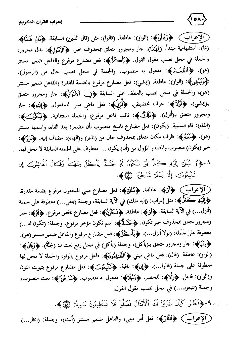 (الواو): عاطفة. (قال): فعل ماض مبني {الظّالِمُونَ}: فاعل مرفوع بالواو، والجملة لا محل لها معطوفة على جملة (قالوا ... ). {إِنْ}: نافية. {تَتَّبِعُونَ}: فعل مضارع مرفوع بثبوت النون و (الواو): فاعل. {إِلاّ}: للحصر. {رَجُلاً}: مفعول به منصوب. {مَسْحُوراً}: نعت منصوب، وجملة (تتبعون ... ) في محل نصب مقول القول.