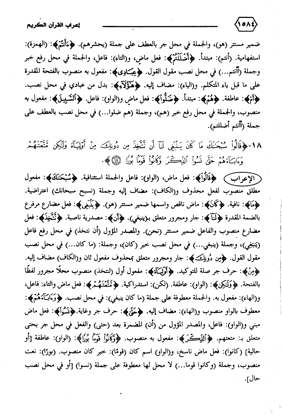 معطوف بالواو منصوب و (الهاء): مضاف إليه. {حَتّى}: حرف جر وغاية. {نَسُوا}: فعل ماض مبني و (الواو): فاعل، والمصدر المؤول من (أن) المضمرة بعد (حتى) والفعل في محل جر بحتى متعلق ب: متعتهم. {الذِّكْرَ}: مفعول به منصوب. {وَكانُوا قَوْماً بُوراً}: (الواو): عاطفة [أو حالية] (كانوا): فعل ماض ناسخ، و (الواو) اسم كان (قوما): خبر كان منصوب. (بورا): نعت منصوب، وجملة (وكانوا قوما ... ) لا محل لها معطوفة على جملة (نسوا) [أو في محل نصب حال].