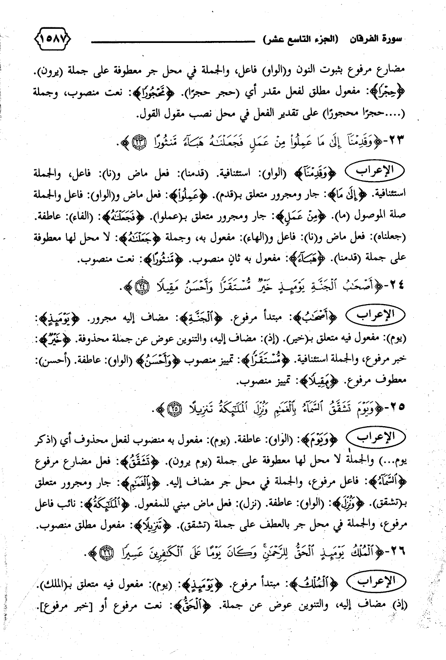 الإعراب {وَقَدِمْنا} (الواو): استئنافية. (قدمنا): فعل ماض و (نا): فاعل، والجملة استئنافية. {إِلى ما}: جار ومجرور متعلق ب (قدم). {عَمِلُوا}: فعل ماض و (الواو): فاعل والجملة صلة الموصول (ما). {مِنْ عَمَلٍ}: جار ومجرور متعلق ب (عملوا). {فَجَعَلْناهُ}: (الفاء): عاطفة.