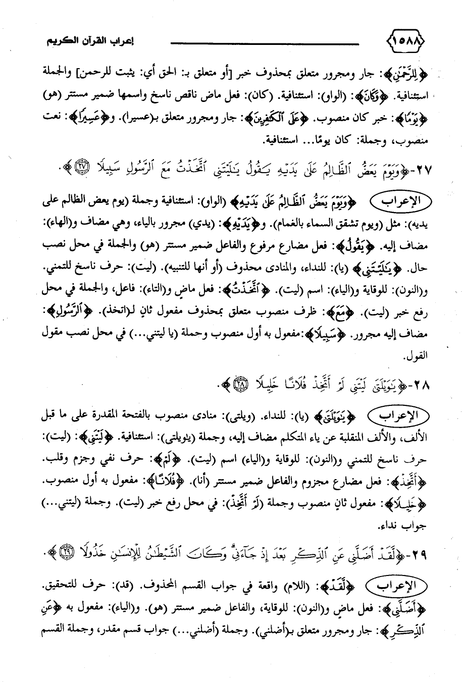 الإعراب {وَيَوْمَ يَعَضُّ الظّالِمُ عَلى يَدَيْهِ} (الواو): استئنافية وجملة (يوم يعض الظالم على يديه): مثل (ويوم تشقق السماء بالغمام).و {يَدَيْهِ}: (يدي) مجرور بالياء، وهي مضاف و (الهاء):