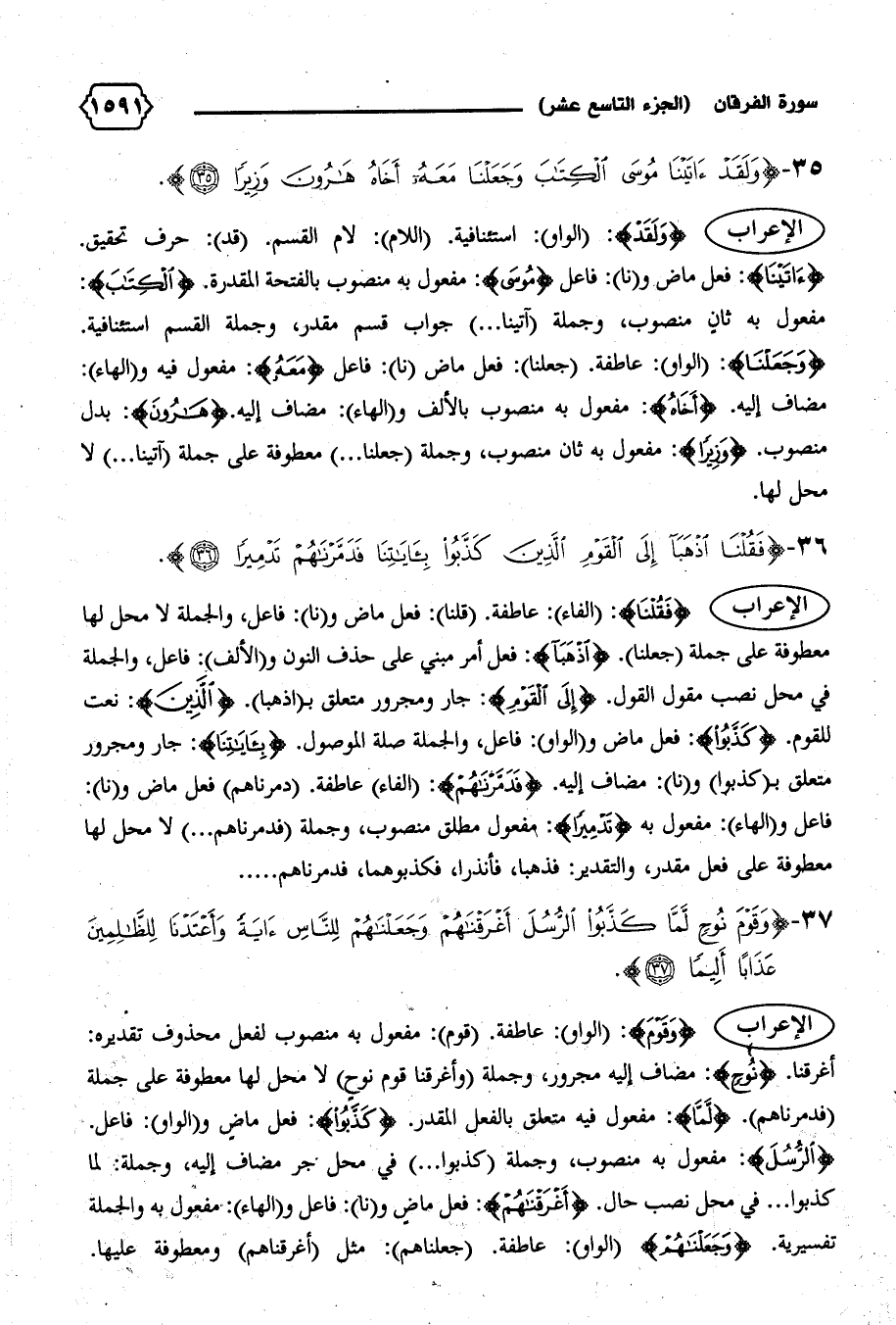 الإعراب {فَقُلْنَا}: (الفاء): عاطفة. (قلنا): فعل ماض و (نا): فاعل، والجملة لا محل لها معطوفة على جملة (جعلنا). {اِذْهَبا}: فعل أمر مبني على حذف النون و (الألف): فاعل، والجملة في محل نصب مقول القول. {إِلَى الْقَوْمِ}: جار ومجرور متعلق ب (اذهبا). {الَّذِينَ}: نعت للقوم. {كَذَّبُوا}: فعل ماض و (الواو): فاعل، والجملة صلة الموصول. {بِآياتِنا}: جار ومجرور متعلق ب (كذبوا) و (نا): مضاف إليه. {فَدَمَّرْناهُمْ}: (الفاء) عاطفة. (دمرناهم) فعل ماض و (نا):
