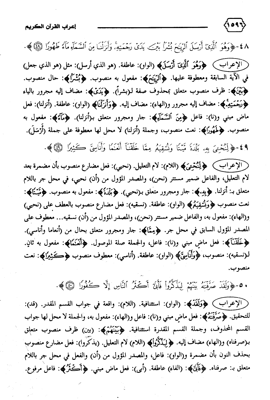 {بَيْنَ}: ظرف منصوب متعلق بمحذوف صفة ل (بشرا). {يَدَيْ}: مضاف إليه مجرور بالياء {رَحْمَتِهِ}: مضاف إليه مجرور و (الهاء): مضاف إليه. {وَأَنْزَلْنا} (الواو): عاطفة. (أنزلنا): فعل ماض مبني و (نا): فاعل {مِنَ السَّماءِ}: جار ومجرور متعلق ب (أنزلنا). {ماءً}: مفعول به منصوب. {طَهُوراً}: نعت منصوب، وجملة (أنزلنا) لا محل لها معطوفة على جملة (أرسل).