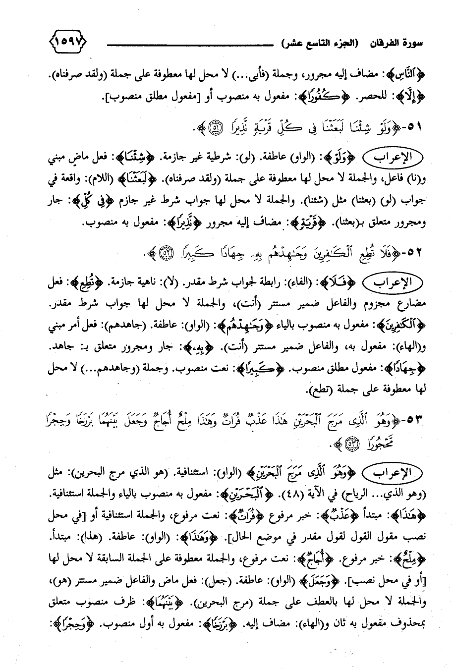 الإعراب {وَهُوَ الَّذِي مَرَجَ الْبَحْرَيْنِ} (الواو): استئنافية. (هو الذي مرج البحرين): مثل (وهو الذي ... الرياح) في الآية (٤٨). {الْبَحْرَيْنِ}: مفعول به منصوب بالياء والجملة استئنافية.
