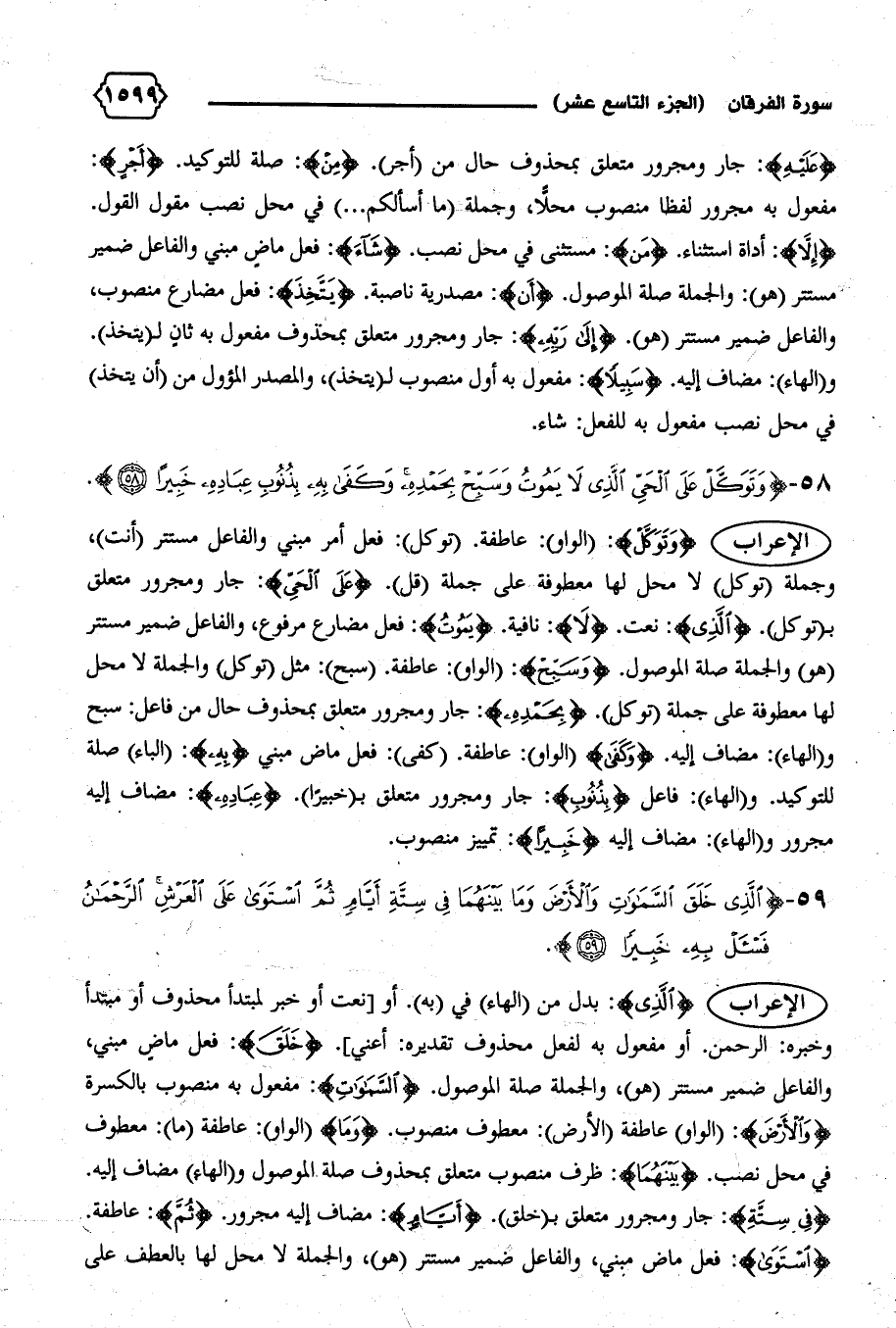 الإعراب {الَّذِي}: بدل من (الهاء) في (به).أو [نعت أو خبر لمبتدإ محذوف أو مبتدأ وخبره: الرحمن. أو مفعول به لفعل محذوف تقديره: أعني]. {خَلَقَ}: فعل ماض مبني، والفاعل ضمير مستتر (هو)، والجملة صلة الموصول. {السَّماواتِ}: مفعول به منصوب بالكسرة {وَالْأَرْضَ}: (الواو) عاطفة (الأرض): معطوف منصوب. {وَما} (الواو): عاطفة (ما): معطوف في محل نصب. {بَيْنَهُما}: ظرف منصوب متعلق بمحذوف صلة الموصول و (الهاء) مضاف إليه.