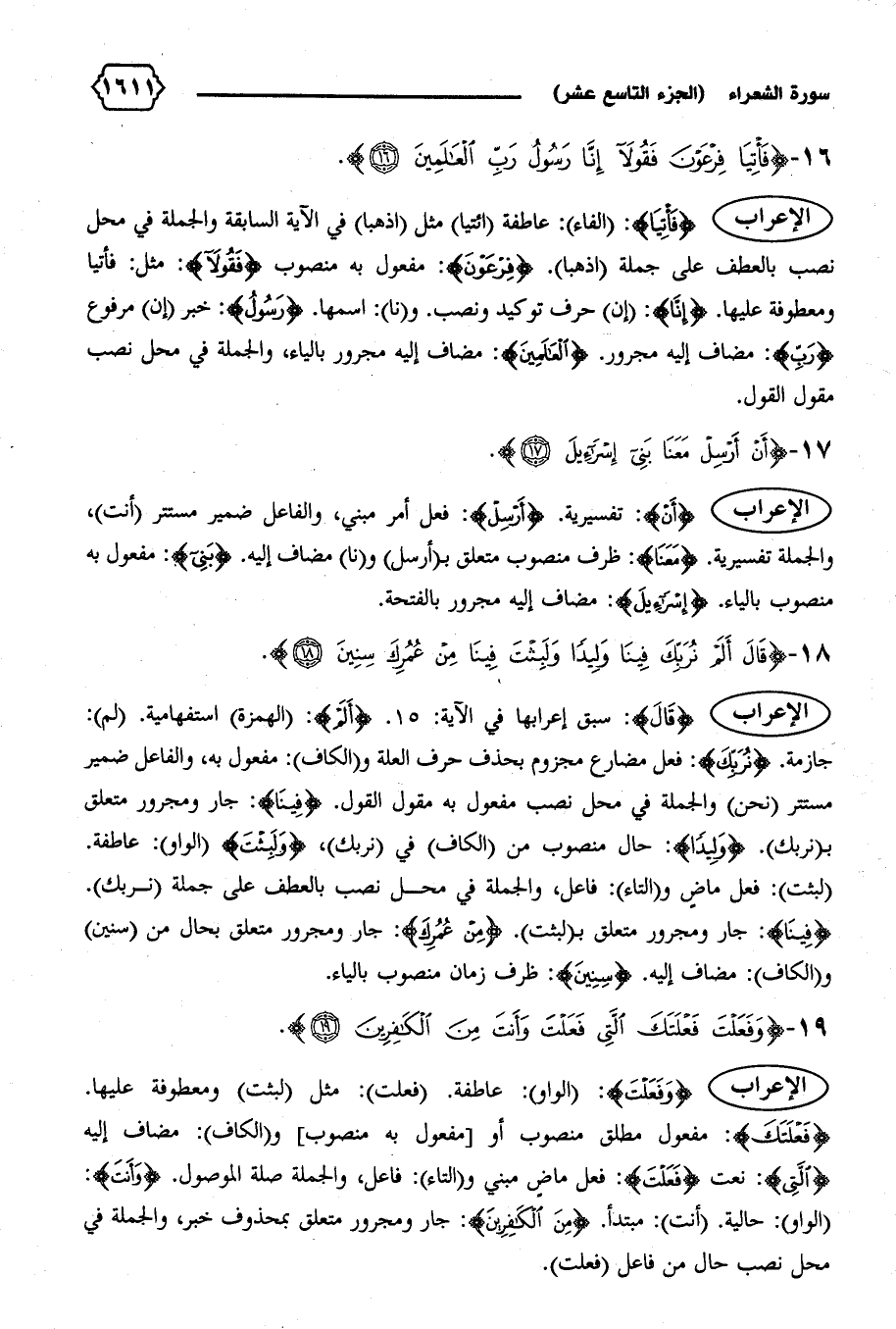 الإعراب {فَأْتِيا}: (الفاء): عاطفة (ائتيا) مثل (اذهبا) في الآية السابقة والجملة في محل نصب بالعطف على جملة (اذهبا). {فِرْعَوْنَ}: مفعول به منصوب {فَقُولا}: مثل: فأتيا ومعطوفة عليها. {إِنّا}: (إن) حرف توكيد ونصب. و (نا): اسمها. {رَسُولُ}: خبر (إن) مرفوع {رَبِّ}: مضاف إليه مجرور. {الْعالَمِينَ}: مضاف إليه مجرور بالياء، والجملة في محل نصب مقول القول.