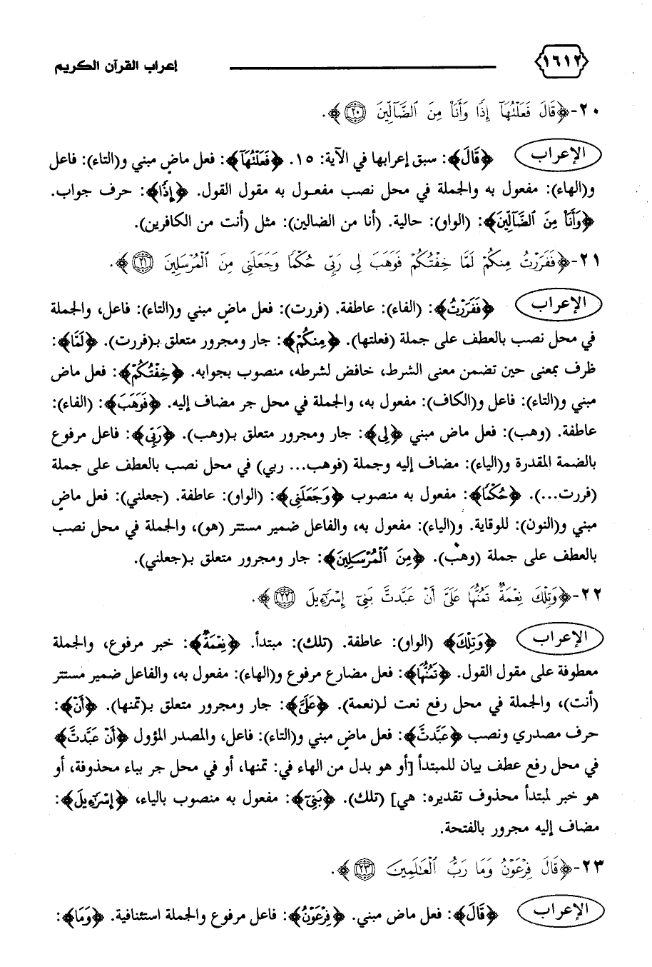 الإعراب {فَفَرَرْتُ}: (الفاء): عاطفة. (فررت): فعل ماض مبني و (التاء): فاعل، والجملة في محل نصب بالعطف على جملة (فعلتها). {مِنْكُمْ}: جار ومجرور متعلق ب (فررت). {لَمّا}: