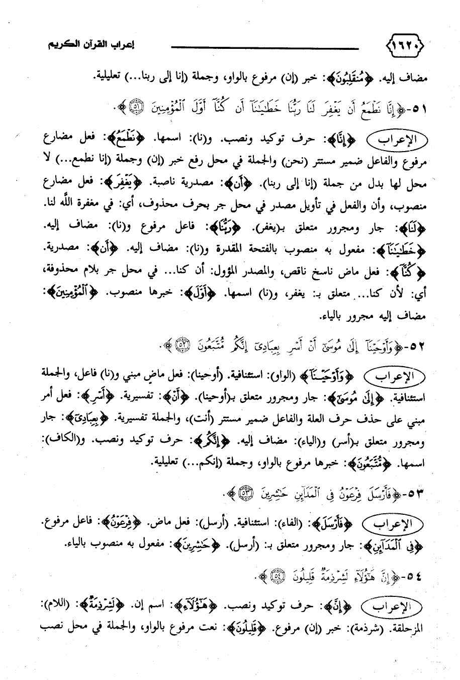 الإعراب {وَأَوْحَيْنا} (الواو): استئنافية. (أوحينا): فعل ماض مبني و (نا) فاعل، والجملة استئنافية. {إِلى مُوسى}: جار ومجرور متعلق ب (أوحينا). {أَنْ}: تفسيرية. {أَسْرِ}: فعل أمر مبني على حذف حرف العلة والفاعل ضمير مستتر (أنت)، والجملة تفسيرية. {بِعِبادِي}: جار ومجرور متعلق ب (أسر) و (الياء): مضاف إليه. {إِنَّكُمْ}: حرف توكيد ونصب. و (الكاف):