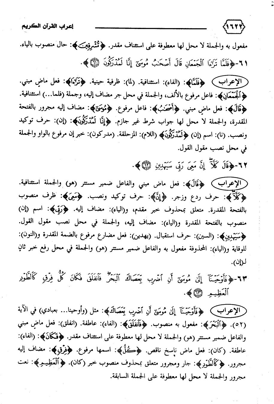 الإعراب {فَأَوْحَيْنا إِلى مُوسى أَنِ اضْرِبْ بِعَصاكَ}: مثل (وأوحينا ... بعبادي) في الآية (٥٢). {الْبَحْرَ}: مفعول به منصوب. {فَانْفَلَقَ}: (الفاء): عاطفة. (انفلق): فعل ماض مبني والفاعل ضمير مستتر (هو) والجملة لا محل لها معطوفة على استئناف مقدر. {فَكانَ}: (الفاء):