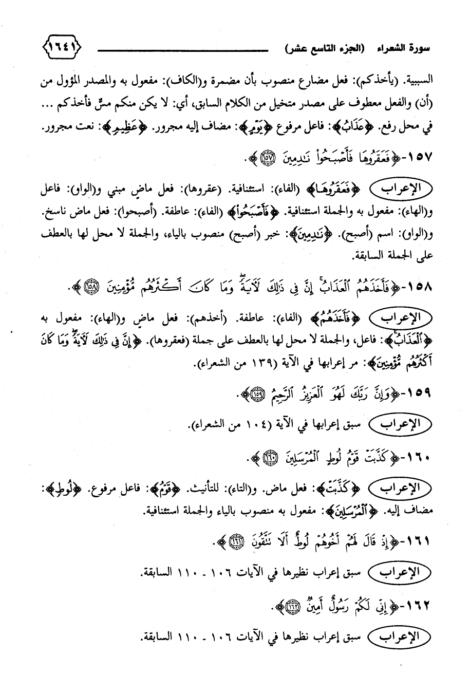 الإعراب {فَأَخَذَهُمُ} (الفاء): عاطفة. (أخذهم): فعل ماض و (الهاء): مفعول به {الْعَذابُ}: فاعل، والجملة لا محل لها بالعطف على جملة (فعقروها). {إِنَّ فِي ذلِكَ لَآيَةً وَما كانَ أَكْثَرُهُمْ مُؤْمِنِينَ}: مر إعرابها في الآية (١٣٩ من الشعراء).