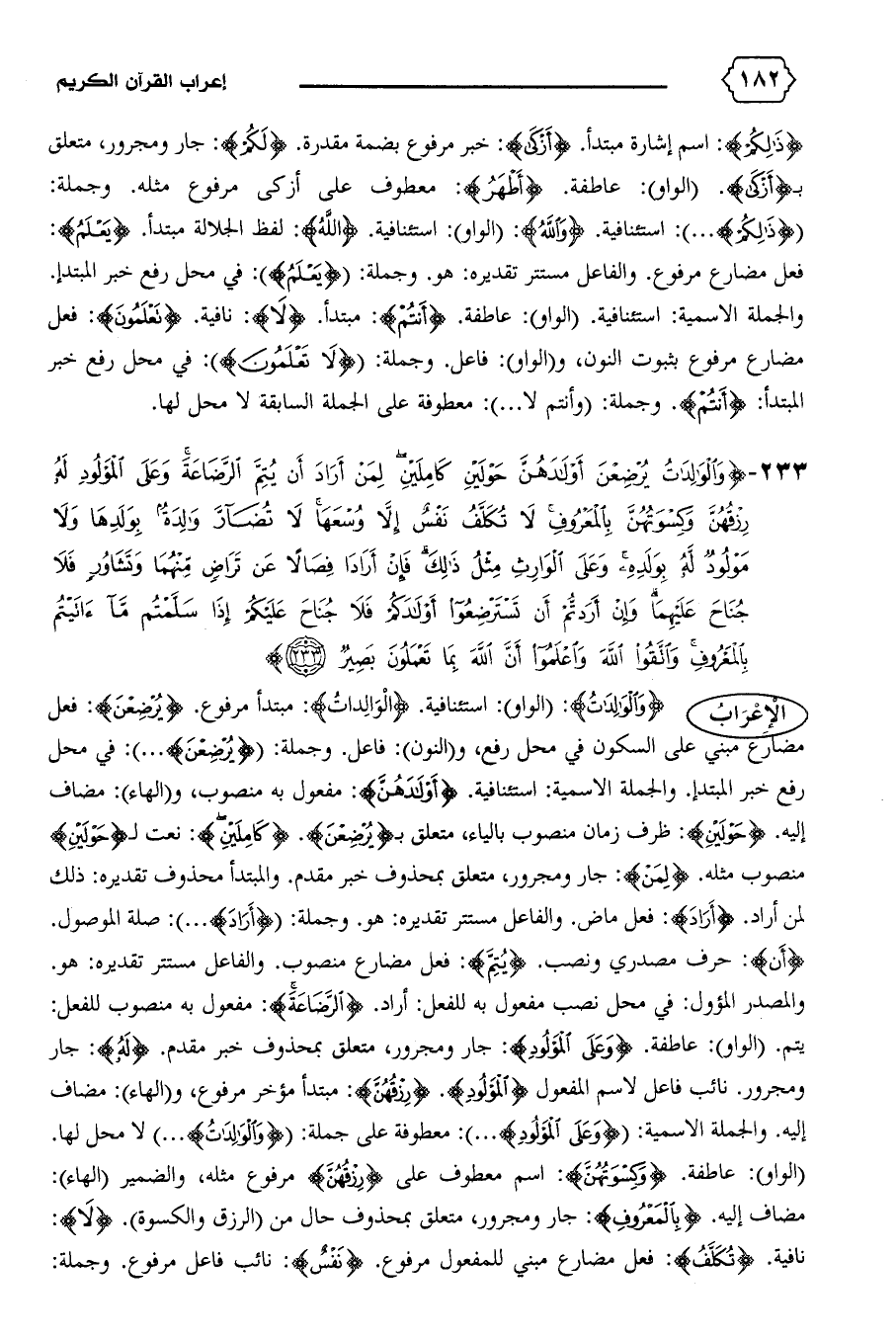{وَالْوالِداتُ}: (الواو): استئنافية. {الْوالِداتُ}: مبتدأ مرفوع. {يُرْضِعْنَ}: فعل مضارع مبني على السكون في محل رفع، و (النون): فاعل. وجملة: {يُرْضِعْنَ ... }: في محل رفع خبر المبتدإ. والجملة الاسمية: استئنافية. {أَوْلادَهُنَّ}: مفعول به منصوب، و (الهاء): مضاف إليه. {حَوْلَيْنِ}: ظرف زمان منصوب بالياء، متعلق ب {يُرْضِعْنَ}. {كامِلَيْنِ}: نعت ل {حَوْلَيْنِ} منصوب مثله. {لِمَنْ}: جار ومجرور، متعلق بمحذوف خبر مقدم. والمبتدأ محذوف تقديره: ذلك لمن أراد. {أَرادَ}: فعل ماض. والفاعل مستتر تقديره: هو. وجملة: {أَرادَ ... }: صلة الموصول.