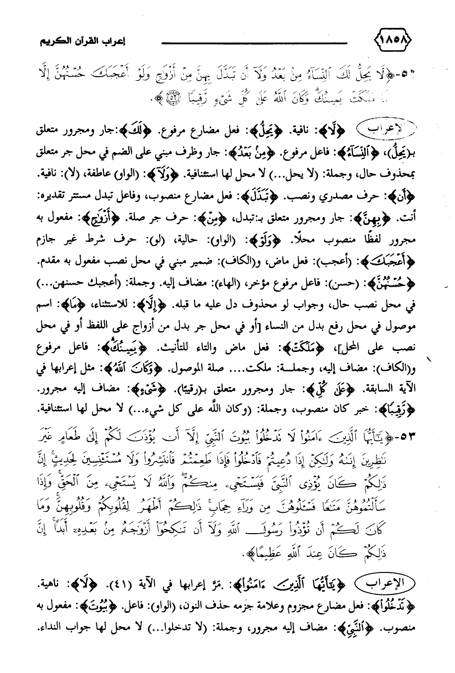الإعراب {لا}: نافية. {يَحِلُّ}: فعل مضارع مرفوع. {لَكَ}: جار ومجرور متعلق ب (يحلّ)، {النِّساءُ}: فاعل مرفوع. {مِنْ بَعْدُ}: جار وظرف مبني على الضم في محل جر متعلق بمحذوف حال، وجملة: (لا يحل ... ) لا محل لها استئنافية. {وَلا}: (الواو) عاطفة، (لا): نافية.