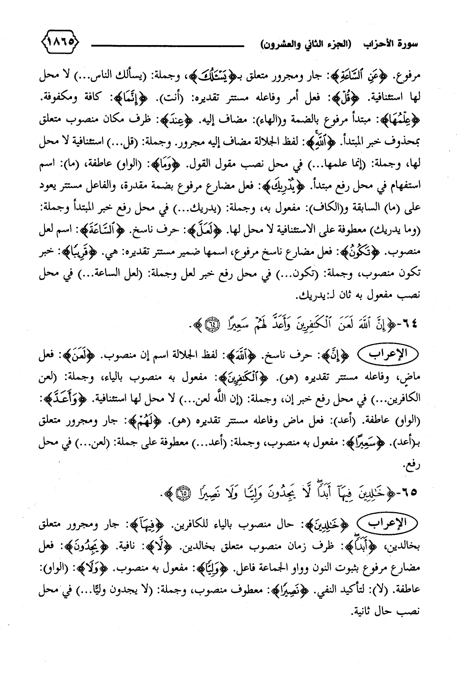 مرفوع. {عَنِ السّاعَةِ}: جار ومجرور متعلق ب {يَسْئَلُكَ،} وجملة: (يسألك الناس ... ) لا محل لها استئنافية. {قُلْ}: فعل أمر وفاعله مستتر تقديره: (أنت). {إِنَّما}: كافة ومكفوفة.