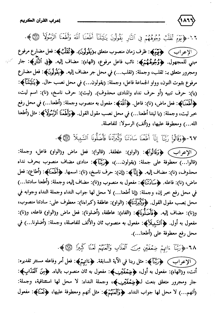 الإعراب {يَوْمَ}: ظرف زمان منصوب متعلق ب (يقولون). {تُقَلَّبُ}: فعل مضارع مرفوع مبني للمجهول. {وُجُوهُهُمْ}: نائب فاعل مرفوع، (الهاء): مضاف إليه. {فِي النّارِ}: جار ومجرور متعلق ب: تقلب، وجملة: (تقلب ... ) في محل جر مضاف إليه. {يَقُولُونَ}: فعل مضارع مرفوع بثبوت النون، وواو الجماعة فاعل، وجملة: (يقولون ... ) في محل نصب حال. {يا لَيْتَنا}: