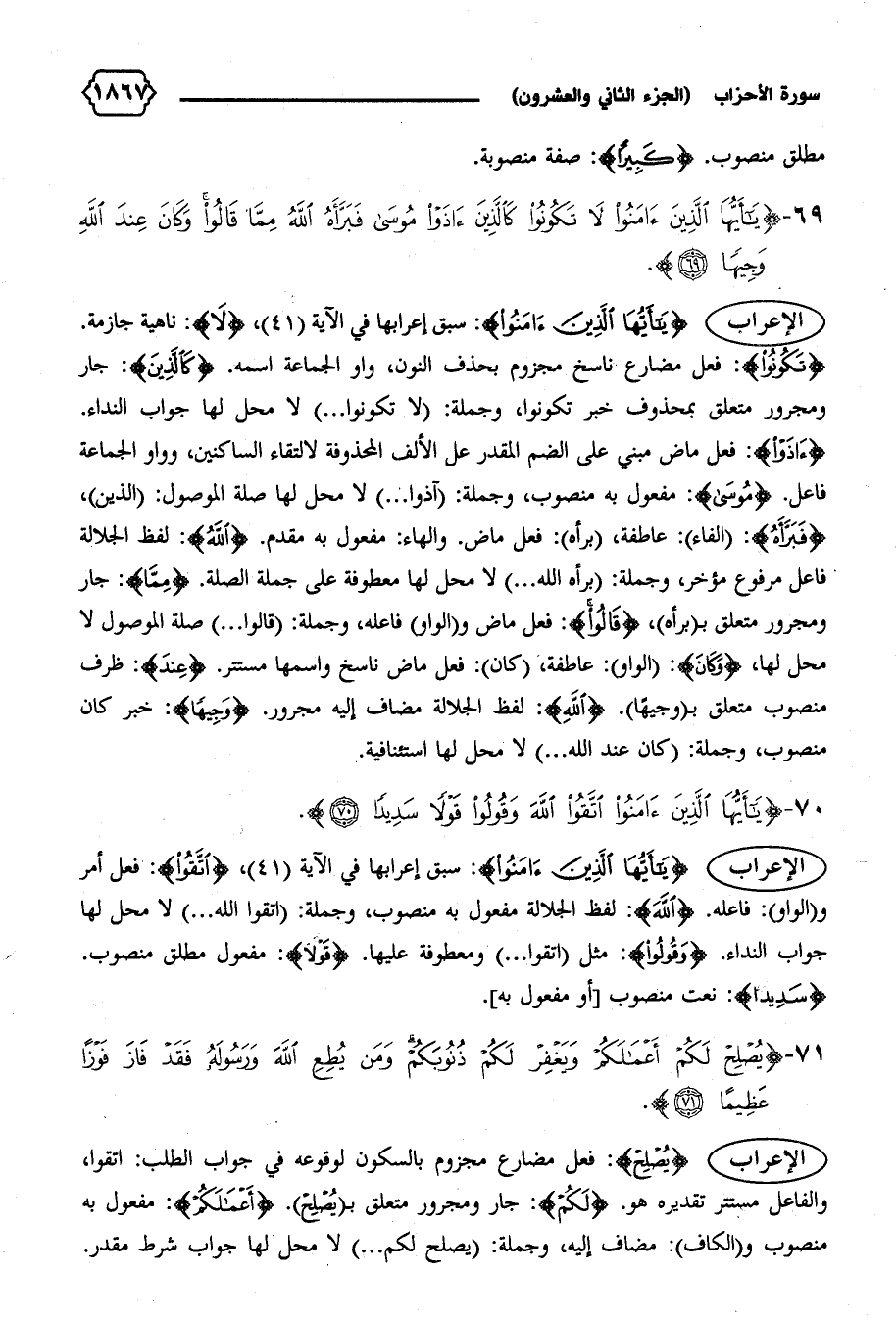الإعراب {يا أَيُّهَا الَّذِينَ آمَنُوا}: سبق إعرابها في الآية (٤١)، {اِتَّقُوا}: فعل أمر و (الواو): فاعله. {اللهَ}: لفظ الجلالة مفعول به منصوب، وجملة: (اتقوا الله ... ) لا محل لها جواب النداء. {وَقُولُوا}: مثل (اتقوا ... ) ومعطوفة عليها. {قَوْلاً}: مفعول مطلق منصوب.