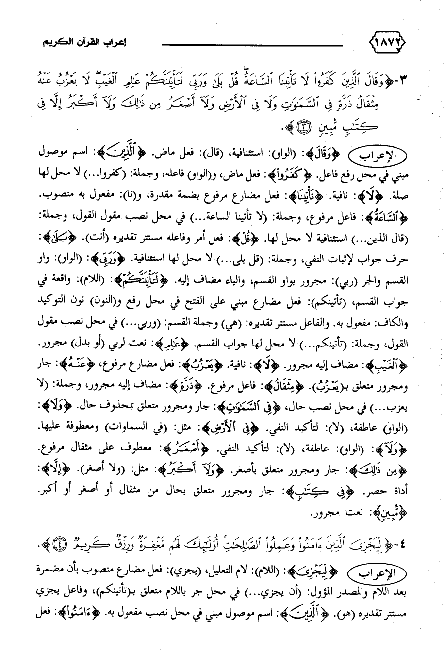 حرف جواب لإثبات النفي، وجملة: (قل بلى ... ) لا محل لها استئنافية. {وَرَبِّي}: (الواو): واو القسم والجر (ربي): مجرور بواو القسم، والياء مضاف إليه. {لَتَأْتِيَنَّكُمْ}: (اللام): واقعة في جواب القسم، (تأتينكم): فعل مضارع مبني على الفتح في محل رفع و (النون) نون التوكيد والكاف: مفعول به. والفاعل مستتر تقديره: (هي) وجملة القسم: (وربي ... ) في محل نصب مقول القول، وجملة: (تأتينكم ... ) لا محل لها جواب القسم. {عالِمِ}: نعت لربي (أو بدل) مجرور.