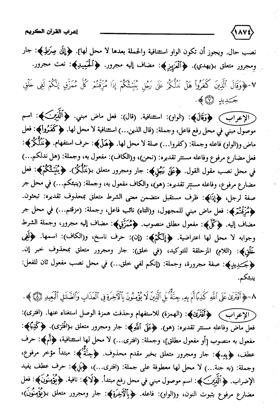 مفعول به منصوب [أو مفعول مطلق]، وجملة: (افترى ... ) لا محل لها استئنافية، {أَمْ}: حرف عطف، {بِهِ}: جار ومجرور متعلق بخبر مقدم محذوف. {جِنَّةٌ}: مبتدأ مؤخر مرفوع، وجملة: (به جنة ... ) لا محل لها معطوفة على جملة: (افترى ... )، {بَلِ}: حرف عطف يفيد الإضراب. {الَّذِينَ}: اسم موصول مبني في محل رفع مبتدأ. {لا}: نافية. {يُؤْمِنُونَ}: فعل مضارع مرفوع بثبوت النون، و (الواو): فاعله. {بِالْآخِرَةِ}: جار ومجرور متعلق ب (يؤمنون)،