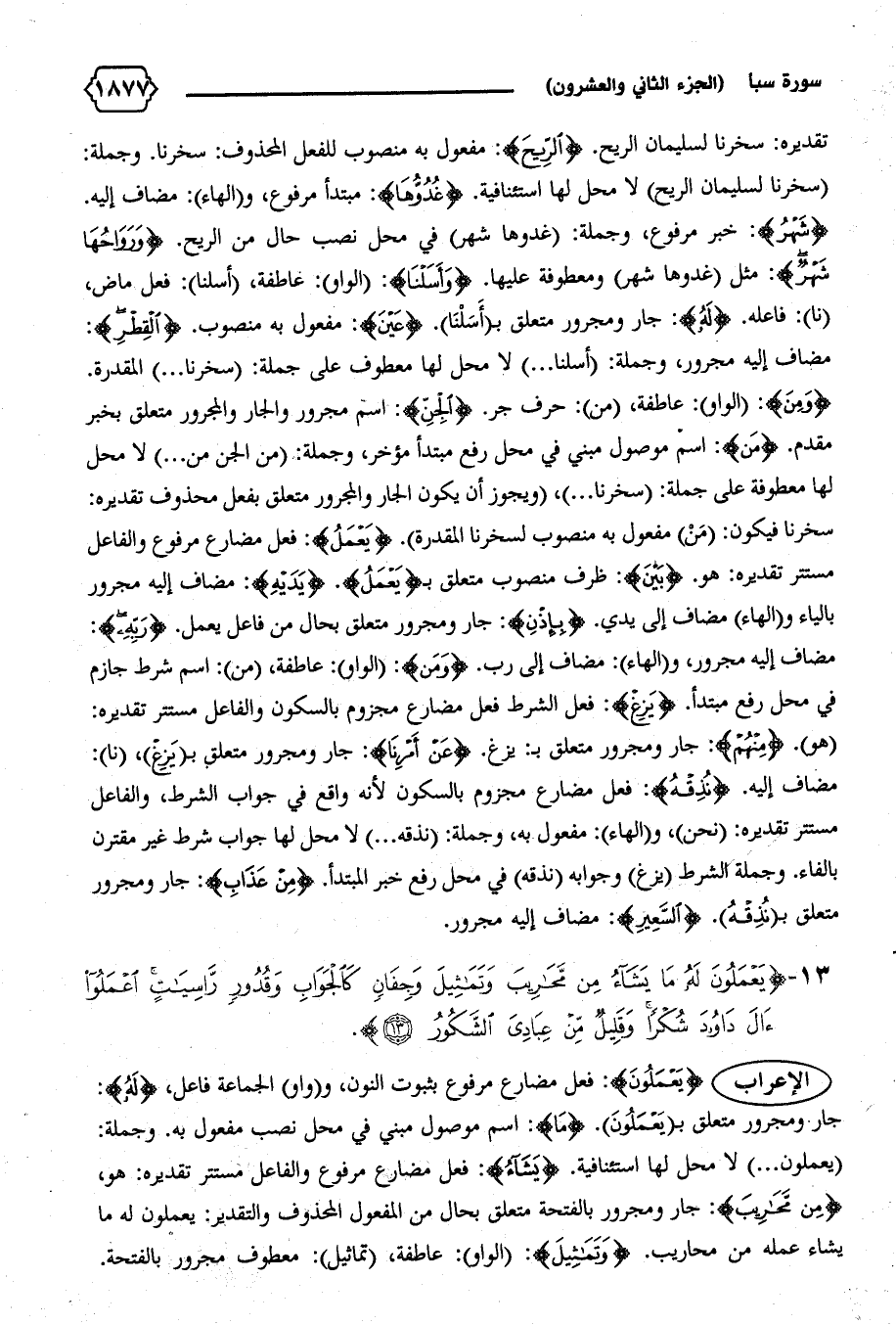 (يعملون ... ) لا محل لها استئنافية. {يَشاءُ}: فعل مضارع مرفوع والفاعل مستتر تقديره: هو، {مِنْ مَحارِيبَ}: جار ومجرور بالفتحة متعلق بحال من المفعول المحذوف والتقدير: يعملون له ما يشاء عمله من محاريب. {وَتَماثِيلَ}: (الواو): عاطفة، (تماثيل): معطوف مجرور بالفتحة.